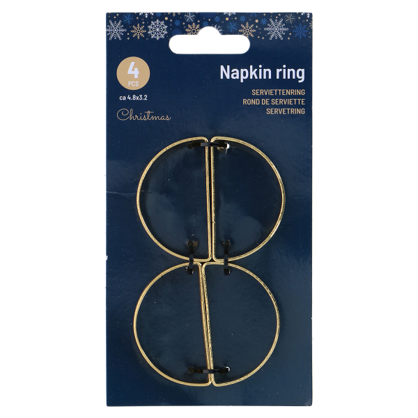 Δαχτυλίδια για πετσέτες φαγητού σετ 4 τεμαχίων από την εταιρεία Alpina. Είναι κατασκευασμένα από μεταλλικό υλικό σε χρυσό χρώμα. Τυλίξτε τις πετσέτες του τραπεζιού για έναν αέρα πραγματικής πολυτέλειας στο γεύμα σας. Ιδανικά για το χριστουγεννιάτικο τραπέζι σας.