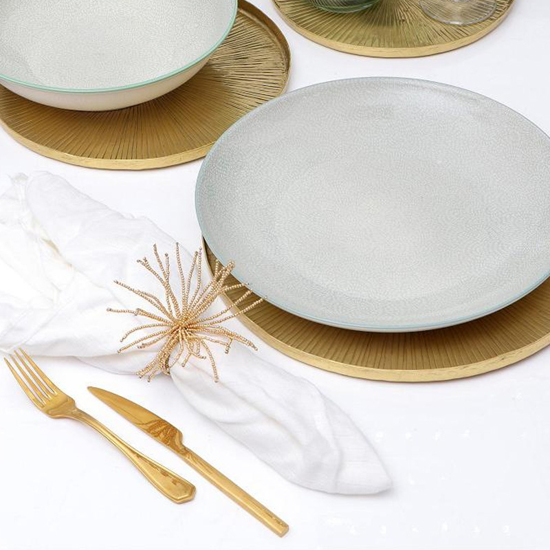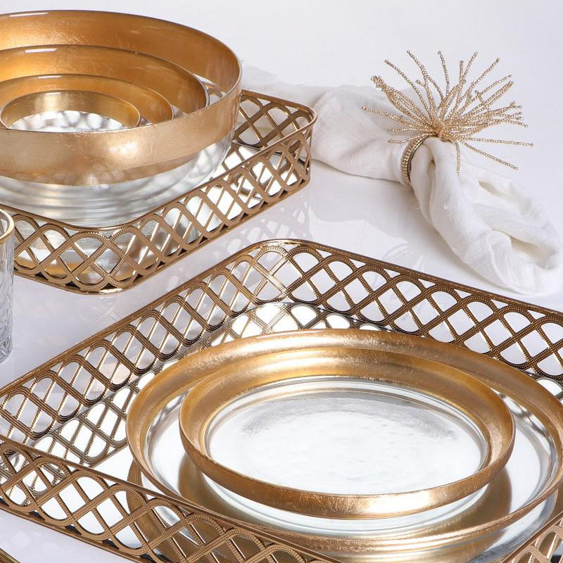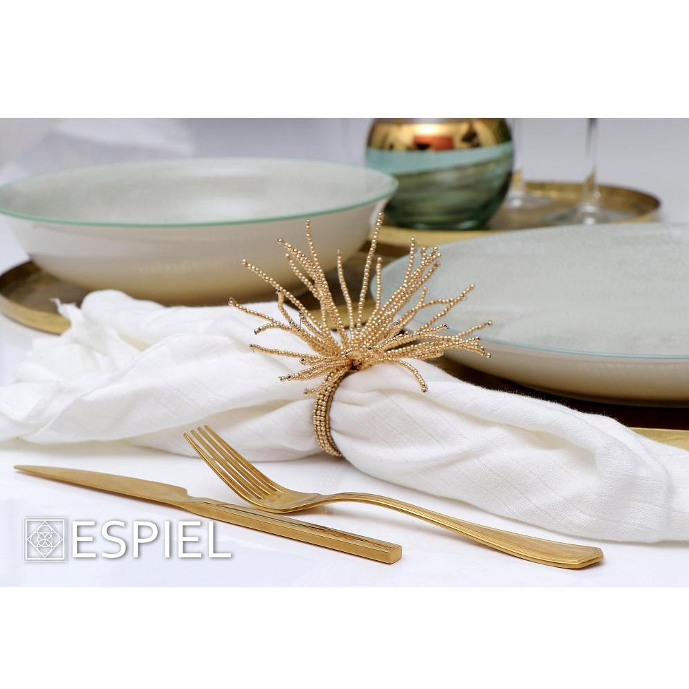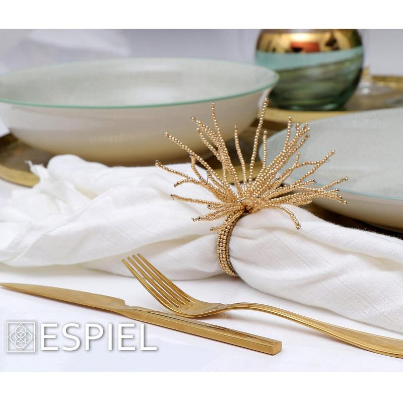 Δαχτυλίδι για πετσέτες φαγητού για να τυλίξετε τις πετσέτες φαγητού και να δώσετε έναν αέρα πολυτέλειας στο γεύμα σας, από την εταιρία Espiel . Είναι κατασκευασμένος από μεταλλικό υλικό σε χρυσό χρώμα και διακοσμητικές χαντρούλες.
