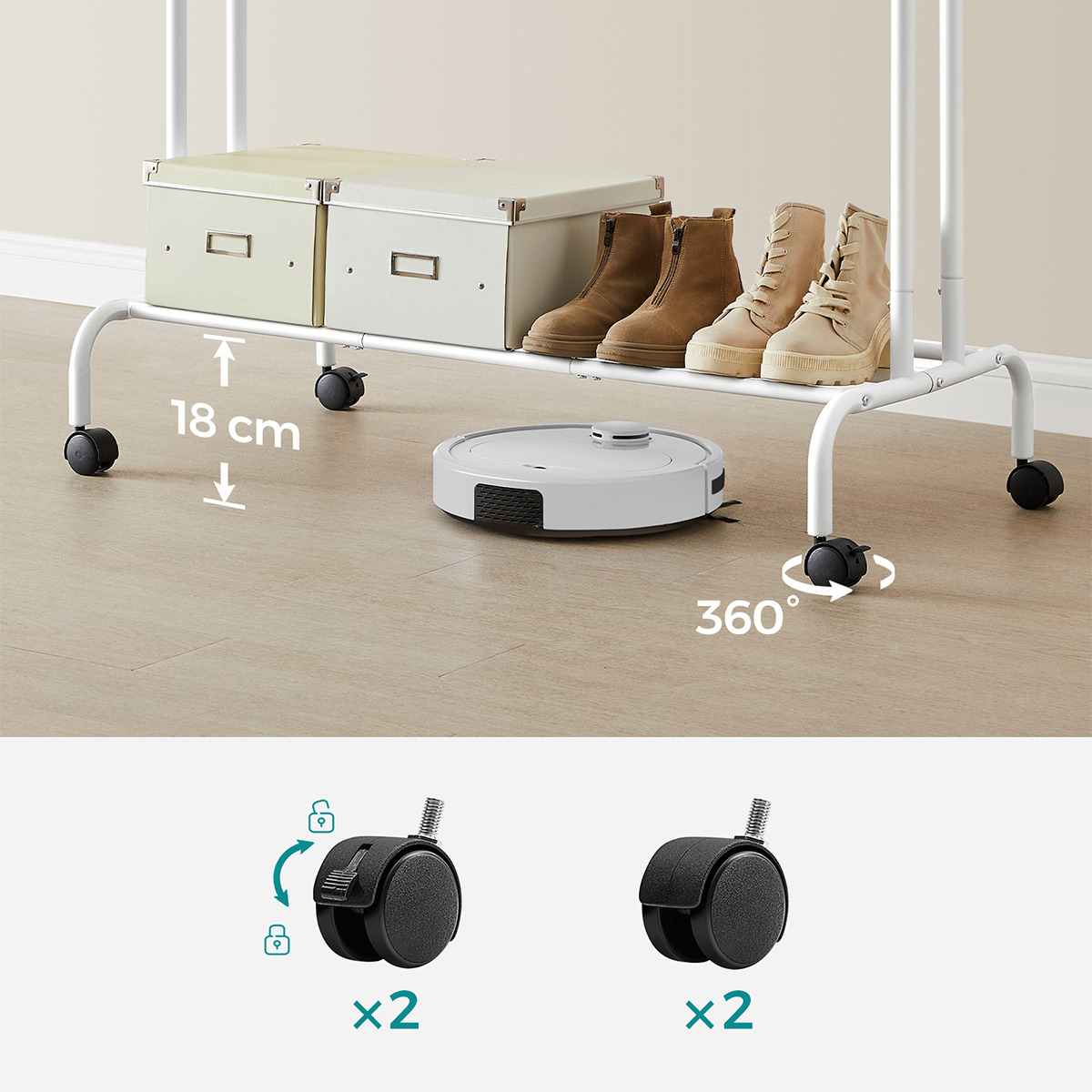 Ράγα ρούχων δαπέδου από την εταιρεία Songmics, με 2 ράγες σε διαφορετικά ύψη. Είναι κατασκευασμένη από μεταλλικό υλικό σε λευκό χρώμα. Στο κάτω μέρος έχει ράφι για έξτρα αποθηκευτικό χώρο που χρησιμεύει και ως παπουτσοθήκη. Επιπλέον, διαθέτει 4 κρεμαστράκια που χρησιμεύουν για τσάντες, ζώνες και αξεσουάρ. Διαθέτει 4 ροδάκια για να μετακινείται εύκολα εκ των οποίων τα οποία 2 έχουν φρένο για μέγιστη σταθερότητα. Ανοιχτή ντουλάπα κατάλληλη για επιπλέον αποθηκευτικό χώρο. Μέγιστο βάρος αντοχής ανά ράγα 30kg. Μέγιστο βάρος αντοχής ανά κρεμάστρα 5kg. Μέγιστο βάρος αντοχής ραφιού 20kg. Συνολικό μέγιστο βάρος αντοχής 100kg. *Το προϊόν έρχεται αμοντάριστο.*