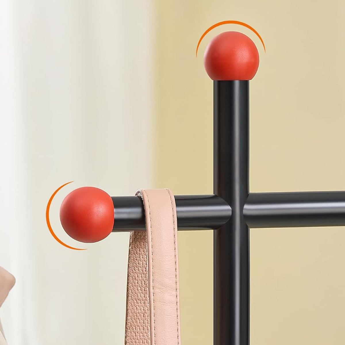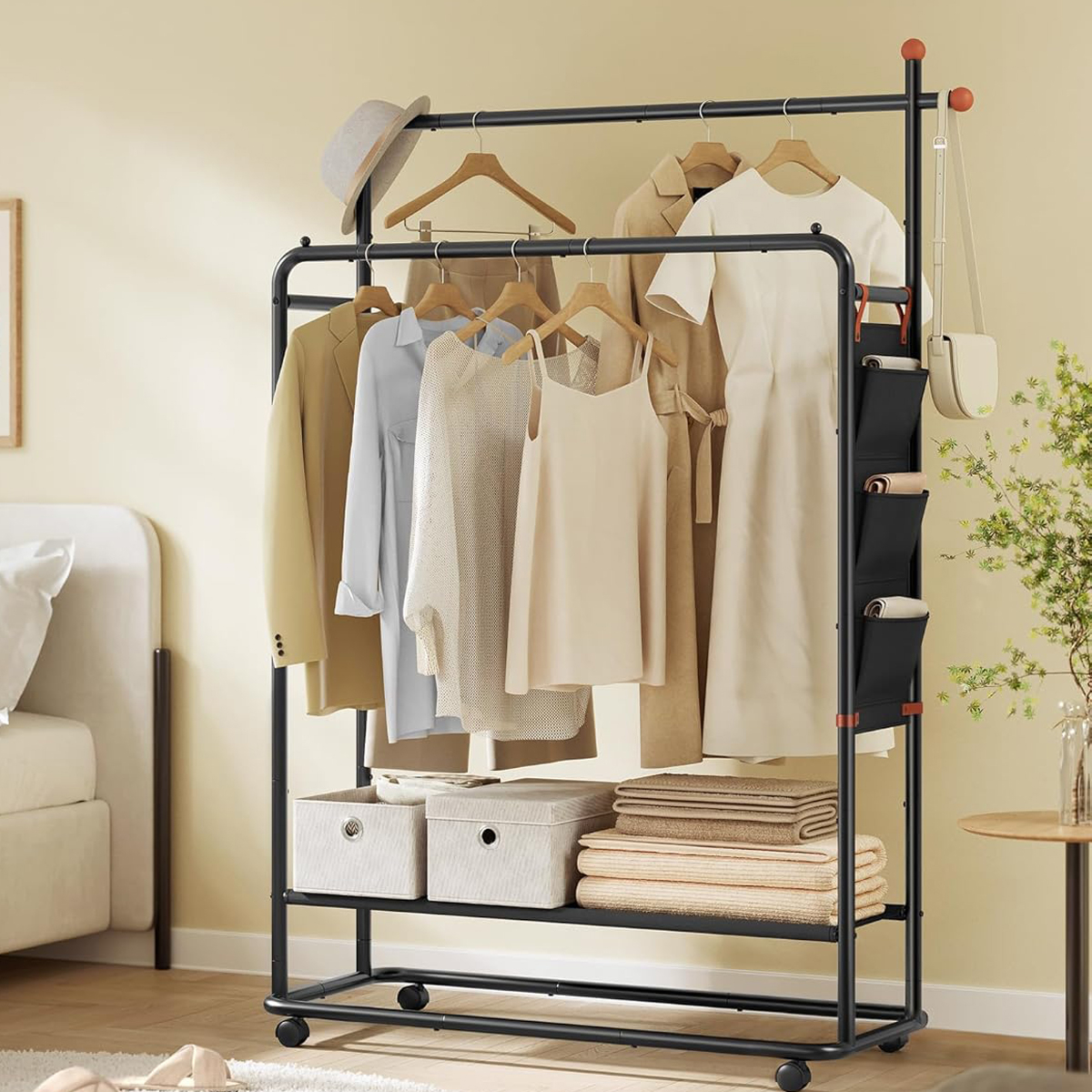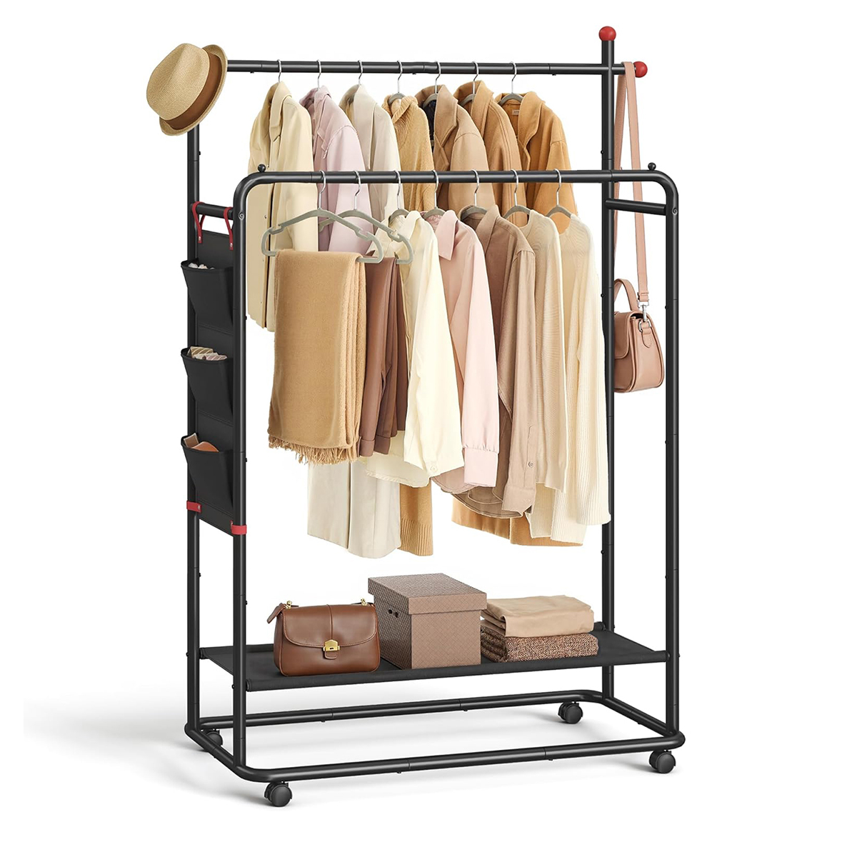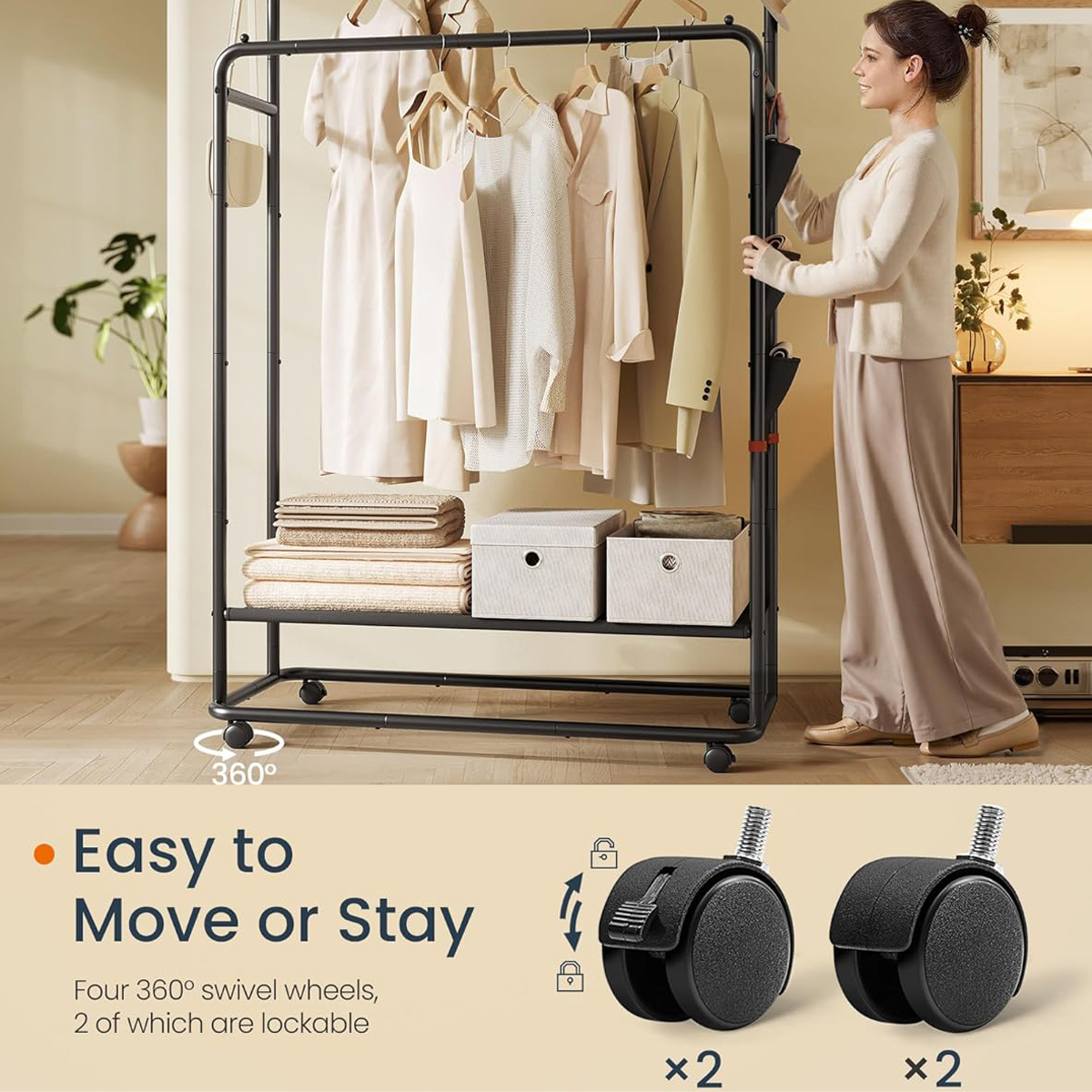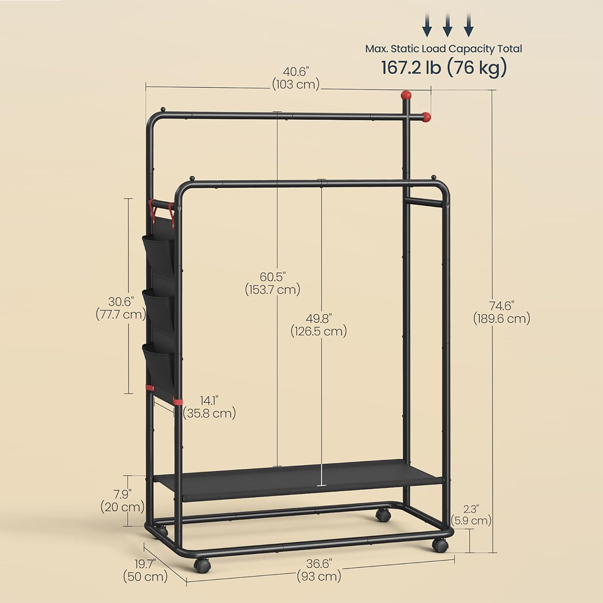 Ράγα ρούχων δαπέδου από την εταιρεία Songmics, με 2 ράγες σε διαφορετικά ύψη. Είναι κατασκευασμένη από μεταλλικό υλικό σε μαύρο ματ χρώμα με κόκκινες λεπτομέρειες. Στο κάτω μέρος έχει υφασμάτινο ράφι για έξτρα αποθηκευτικό χώρο που χρησιμεύει και ως παπουτσοθήκη. Επιπλέον, διαθέτει έναν υφασμάτινο οργανωτή στο πλάι με 3 θήκες. Διαθέτει 4 ροδάκια για να μετακινείται εύκολα εκ των οποίων τα οποία 2 έχουν φρένο για μέγιστη σταθερότητα. Ανοιχτή ντουλάπα κατάλληλη για επιπλέον αποθηκευτικό χώρο. Μέγιστο βάρος αντοχής ανά ράγα 30kg. Μέγιστο βάρος οργανωτή 6kg. Μέγιστο βάρος αντοχής ραφιού 10kg. Συνολικό μέγιστο βάρος αντοχής 76kg. *Το προϊόν έρχεται αμοντάριστο.*