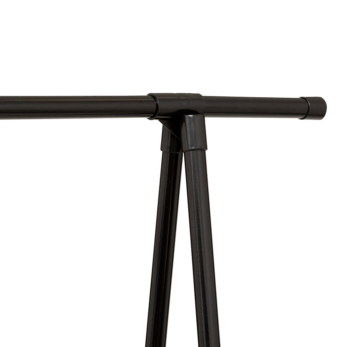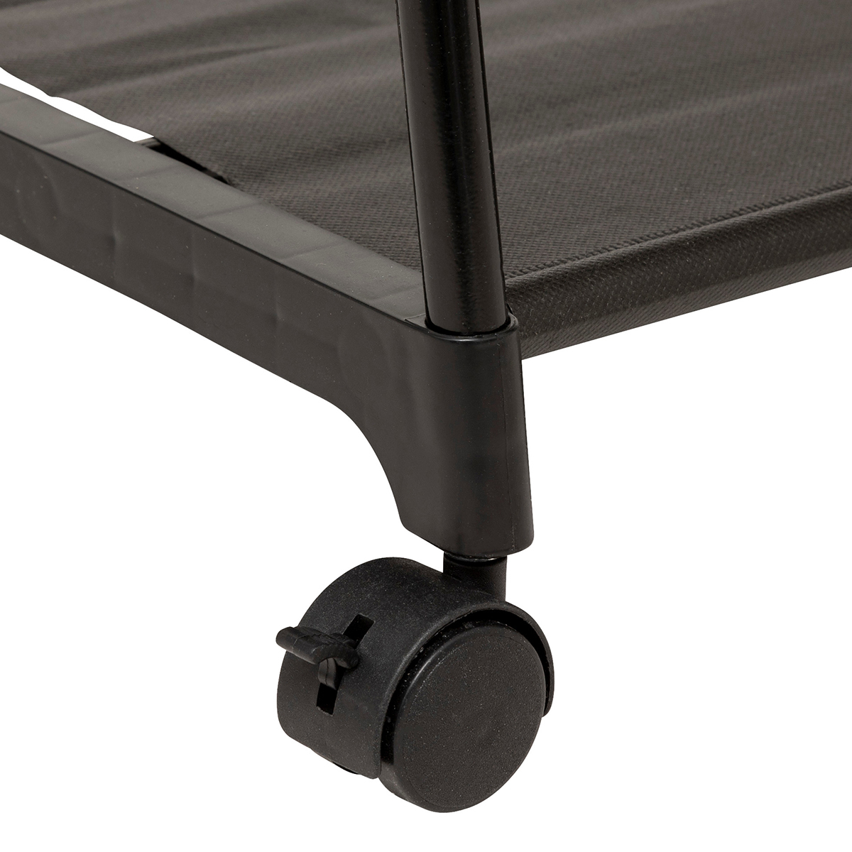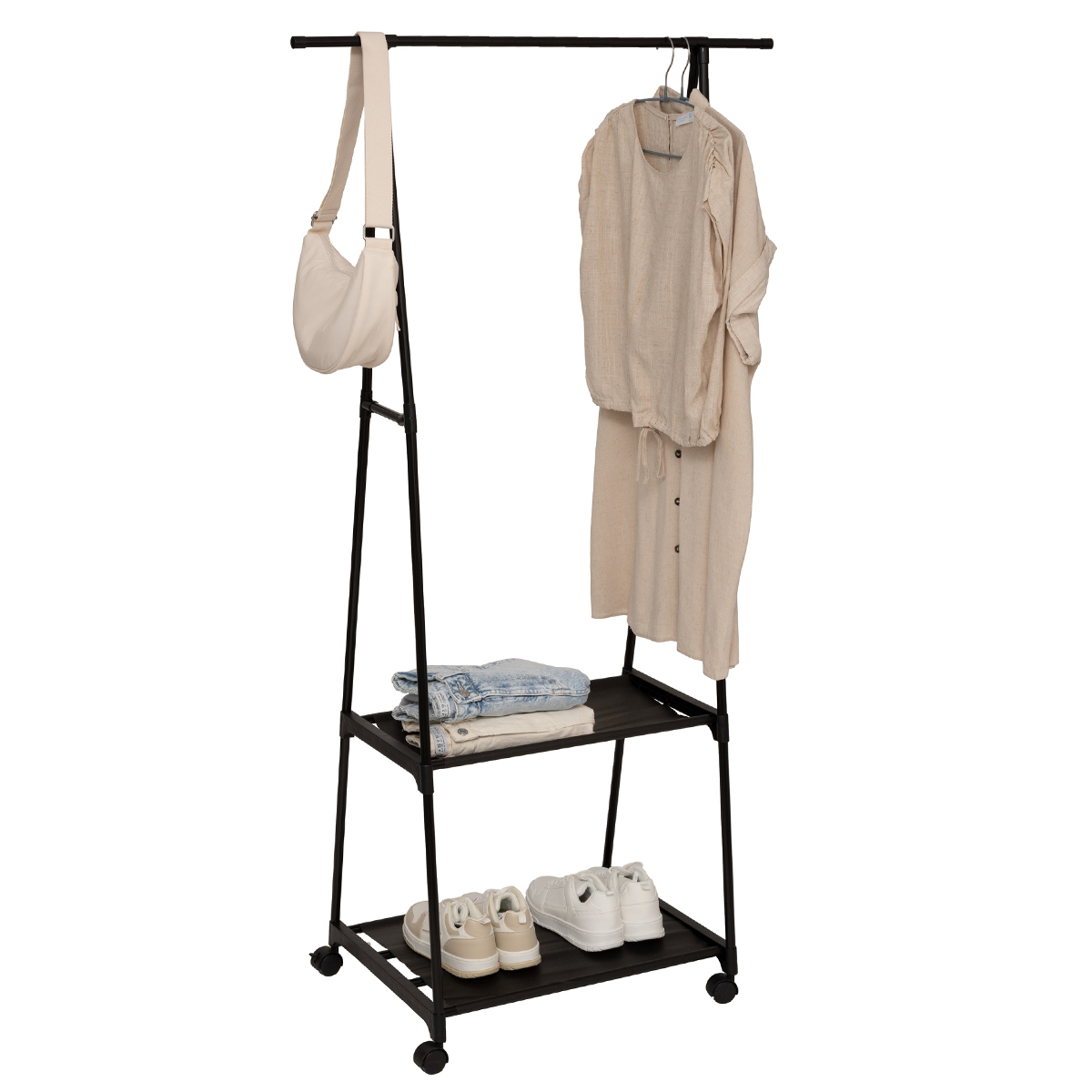 Ράγα ρούχων δαπέδου, κατασκευασμένη από μεταλλικό υλικό σε μαύρο χρώμα. Στο κάτω μέρος έχει 2 υφασμάτινα ράφια για να βάζετε πράγματα όπως καλάθια, διπλωμένα ρούχα ή παπούτσια. Είναι τροχήλατη, καθώς έχει ροδάκια για να μετακινείται εύκολα. Τα 2 ροδάκια έχουν φρένο για μέγιστη σταθερότητα. Ανοιχτή ντουλάπα κατάλληλη για επιπλέον αποθηκευτικό χώρο. Μέγιστο βάρος αντοχής: 10kg. *Το προϊόν έρχεται αμοντάριστο.*