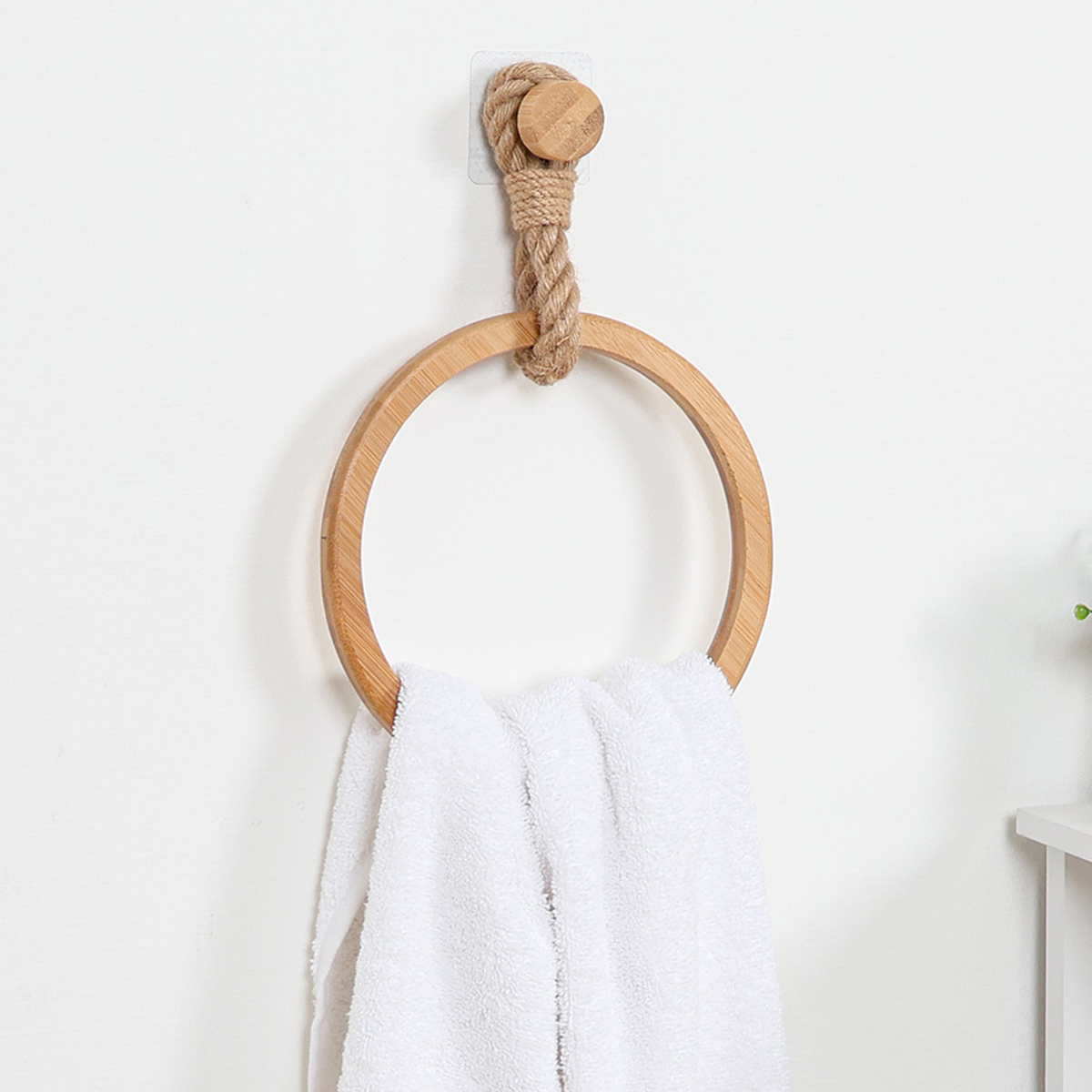 Κρίκος για πετσέτα με μοντέρνο σχεδιασμό. Είναι κατασκευασμένος από ξύλο bamboo σε φυσική μπεζ απόχρωση και έχει λεπτομέρεια από μπεζ σχοινί. Ο πιο έξυπνος και εξυπηρετικός τρόπος για να εξοικονομήσετε χώρο. Στερεώνεται στον τοίχο με αυτοκόλλητο για να μην τρυπάτε τα πλακάκια ή τον τοίχο σας. Συνδυάστε το με τα υπόλοιπα προϊόντα του ίδιου σετ για ένα ολοκληρωμένο αποτέλεσμα.