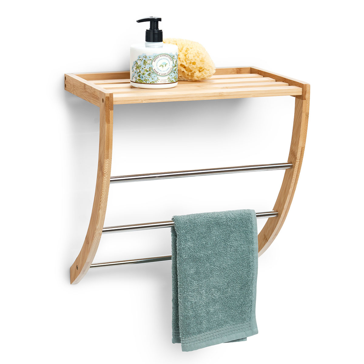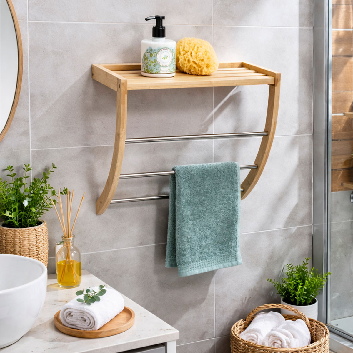 Κρεμάστρα για πετσέτες με ράφι, ιδανική για την οργάνωση του χώρου του μπάνιου. Είναι κατασκευασμένη από ξύλο bamboo σε φυσική απόχρωση. Διαθέτει τρεις μεταλλικές μπάρες για τοποθέτηση πετσετών, προσφέροντας καλύτερο αερισμό και γρηγορότερο στέγνωμα, ενώ το επάνω ράφι προσφέρει επιπλέον χώρο για αποθήκευση μικρών αντικειμένων ή προϊόντων μπάνιου. Ο συνδυασμός μπαμπού και μετάλλου δημιουργεί μια κομψή και φυσική αισθητική που ταιριάζει εύκολα σε κάθε μπάνιο.