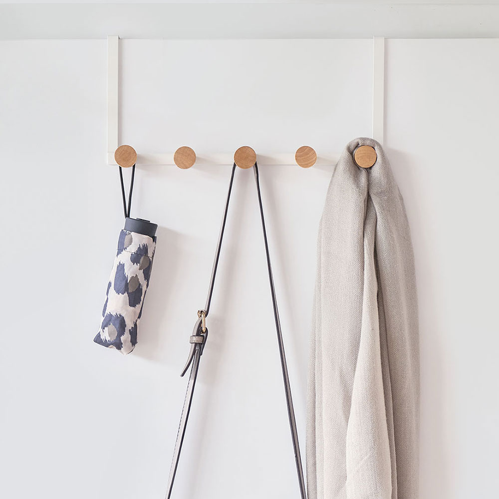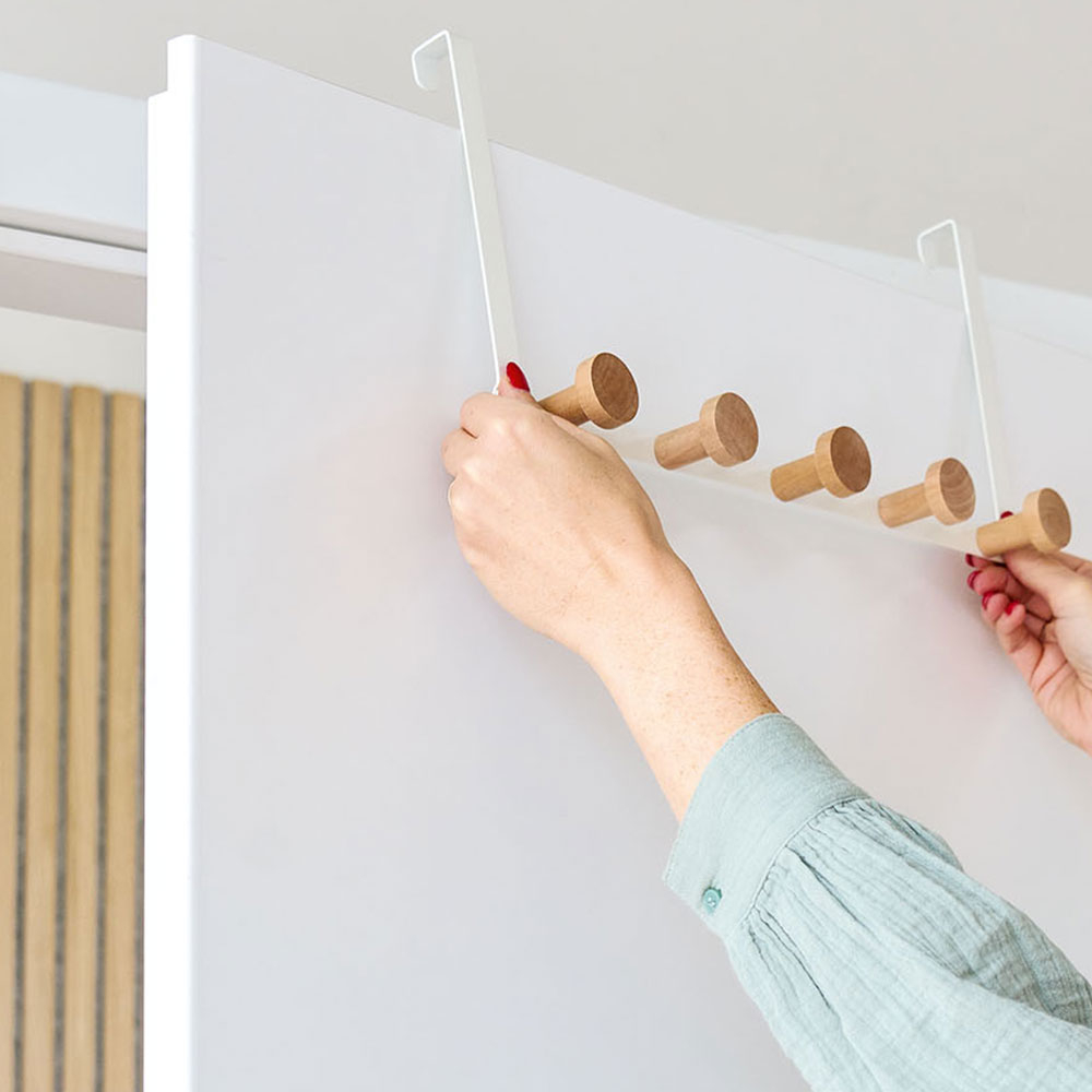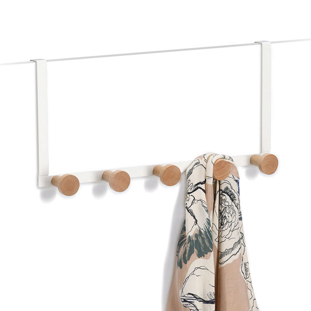 Κρεμάστρα πόρτας 5 θέσεων με μοντέρνο σχεδιασμό. Είναι κατασκευασμένη από μεταλλικό υλικό σε λευκό χρώμα με λεπτομέρειες από μπεζ ξύλο. Μπορείτε να τη χρησιμοποιήσετε στο υπνοδωμάτιο για τις τσάντες και τα ρούχα σας, στο μπάνιο για τη ρόμπα και τις πετσέτες σας ή όπου αλλού θέλετε. Κατάλληλο για πλάτη πόρτας έως 2εκ.