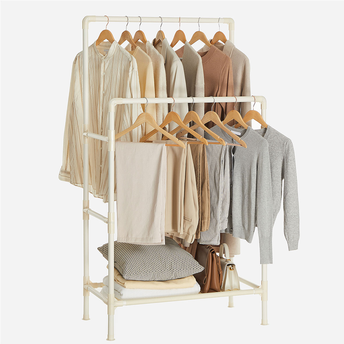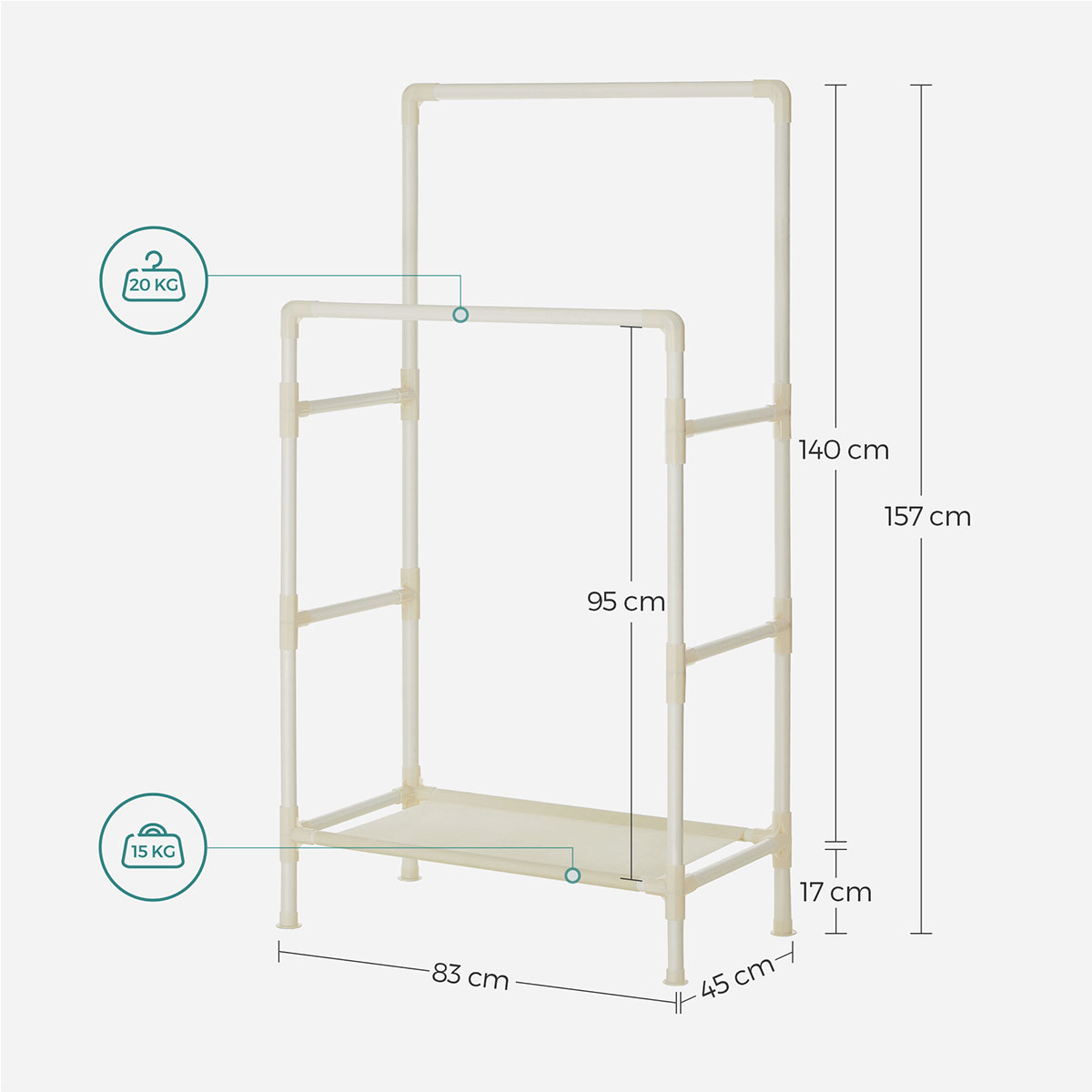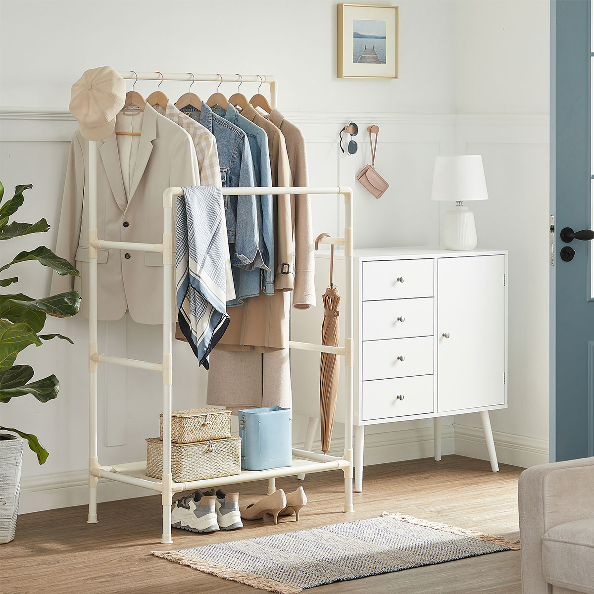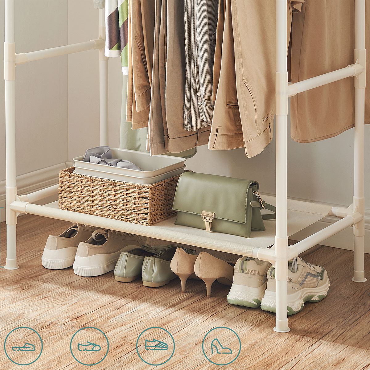 Διπλή ράγα ρούχων δαπέδου από την εταιρεία Songmics. Είναι κατασκευασμένη από μεταλλικό υλικό σε λευκό χρώμα με λευκούς πλαστικού συνδέσμους. Στο κάτω μέρος έχει ράφι από ύφασμα non-woven σε λευκό χρώμα για να βάζετε πράγματα όπως καλάθια ή παπούτσια. Κάτω από το ράφι έχει επαρκή χώρο για να τοποθετήσετε παπούτσια. Ανοιχτή ντουλάπα κατάλληλη για επιπλέον αποθηκευτικό χώρο. Μέγιστο βάρος αντοχής ανά ράγα: 20kg. Μέγιστο βάρος αντοχής ραφιού: 15kg. Μπορεί να αντέξει συνολικά έως 55kg. *Το προϊόν έρχεται αμοντάριστο.*