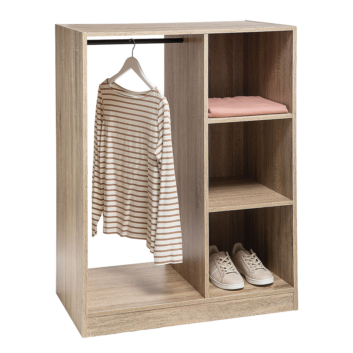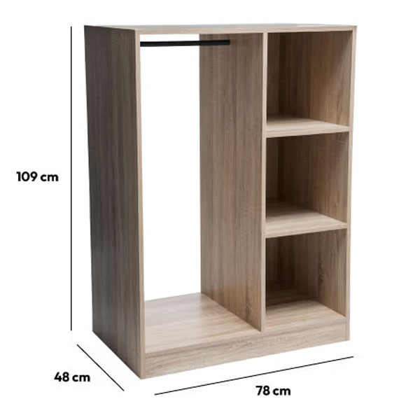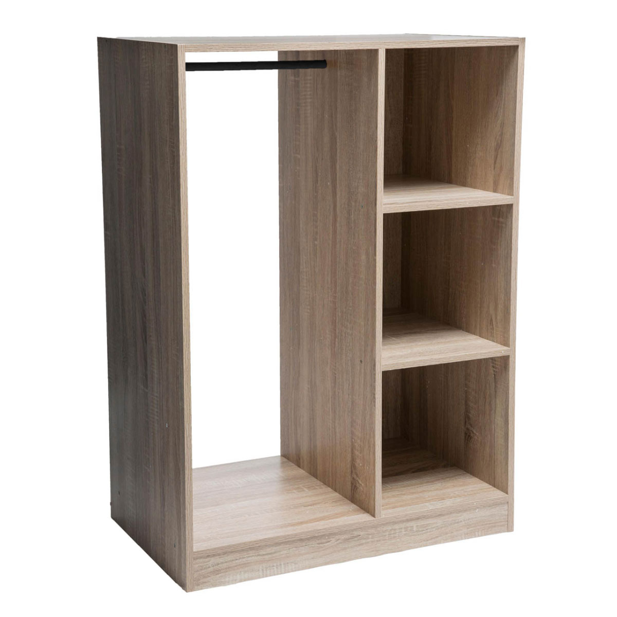 Κρεμάστρα δαπέδου με ράφια για κρεμαστά και διπλωμένα ρούχα, σε φυσικό χρώμα ξύλου και μαύρη μεταλλική ράγα ρούχων. Ιδανική γκαρνταρόμπα για τα ρούχα, τα αξεσουάρ ή τα παπούτσια σας. Λειτουργεί σαν ανοιχτή ντουλάπα και σας προσφέρει επιπλέον αποθηκευτικό χώρο. Το προϊόν έρχεται αμοντάριστο και συναρμολογείται βάσει οδηγιών.