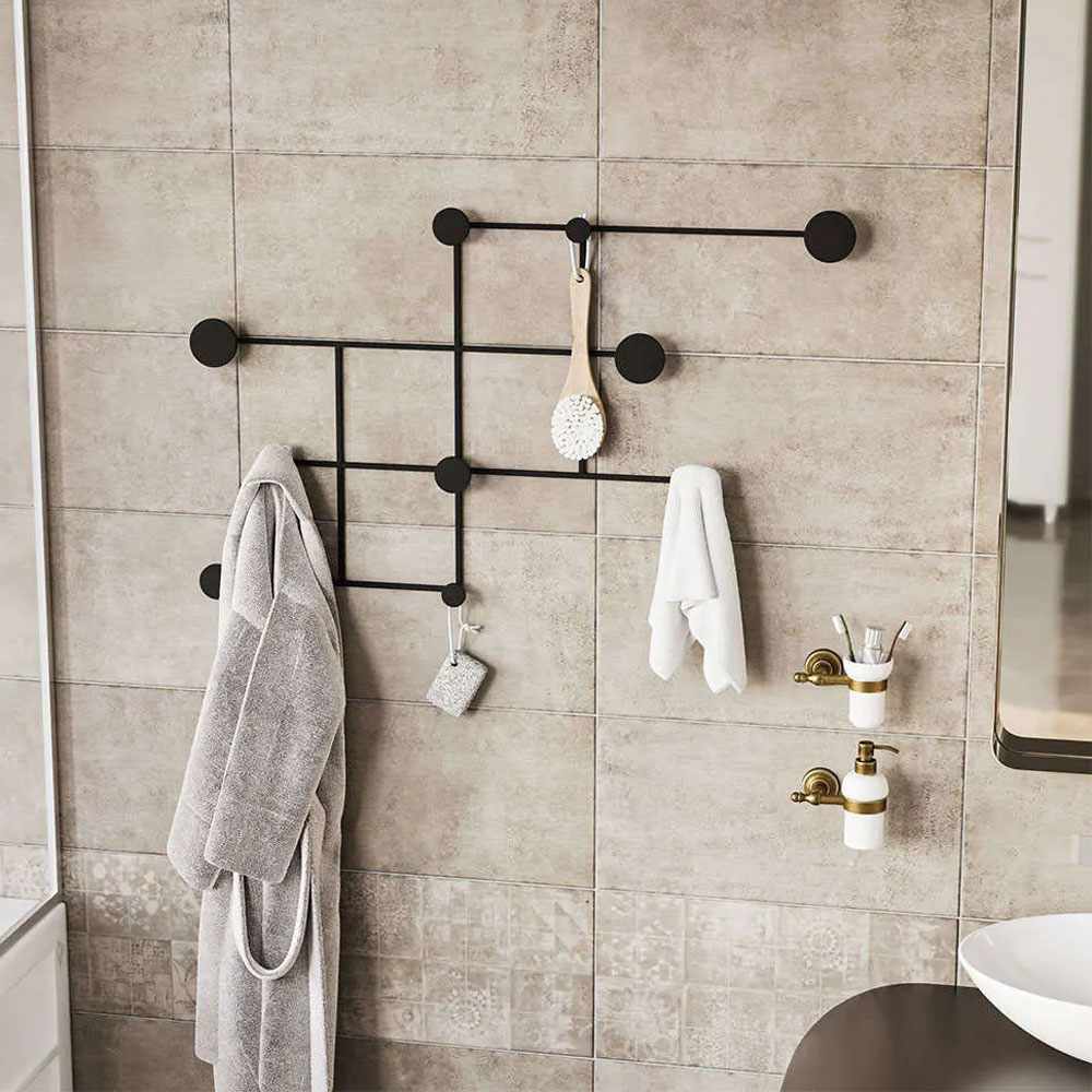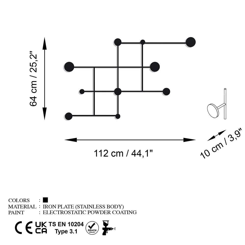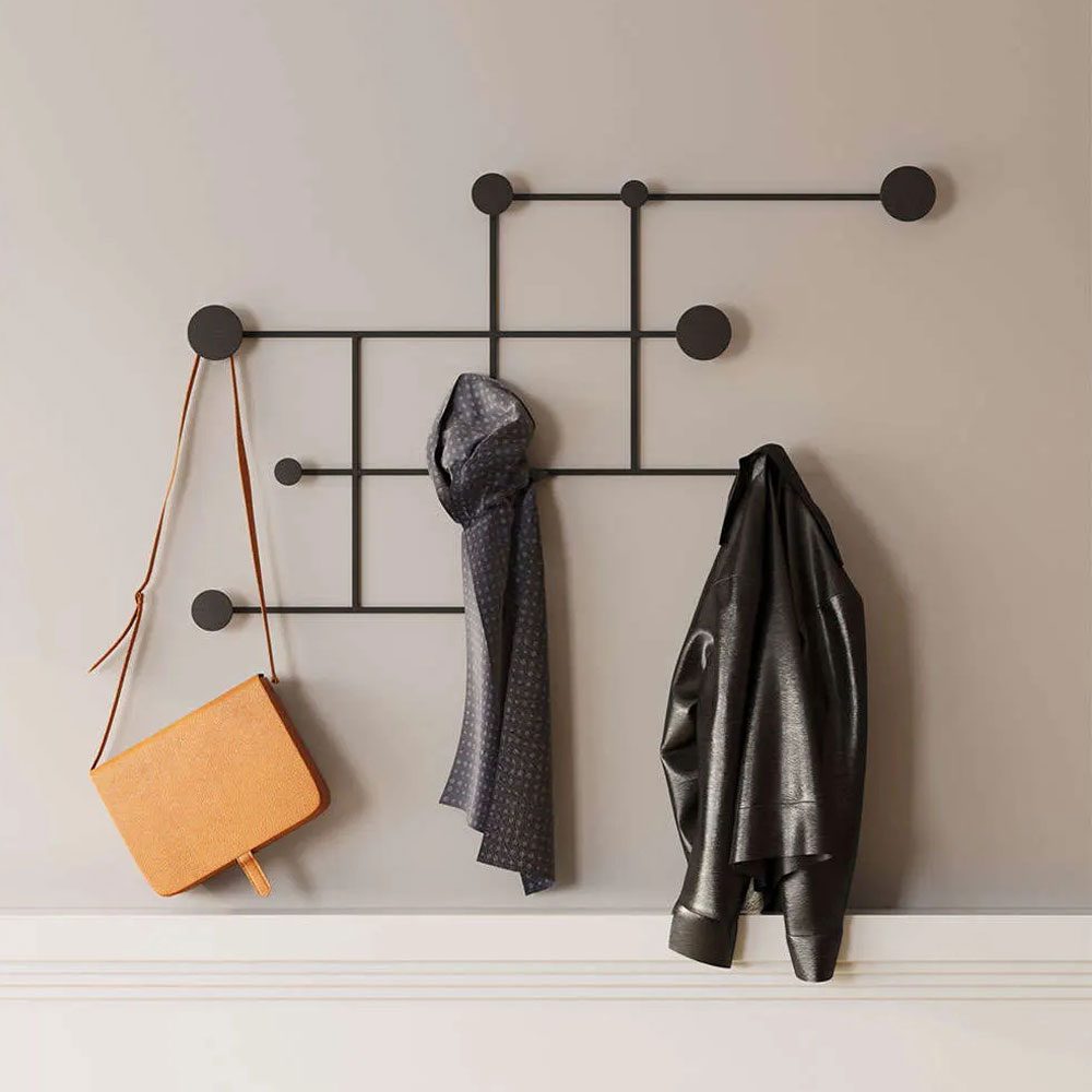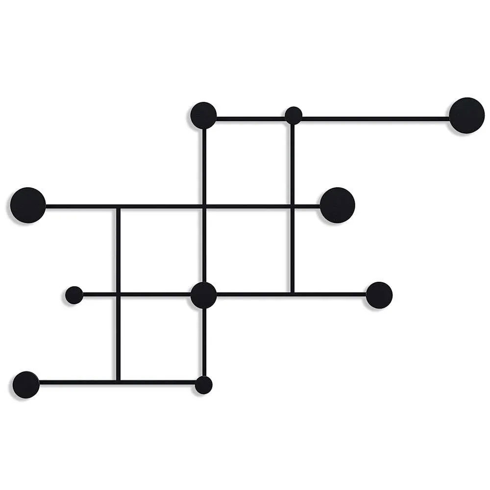Κρεμάστρα τοίχου με 10 άγκιστρα σε μαύρο χρώμα κατασκευασμένη από μέταλλο. Ιδανική για την είσοδο, το χωλ ή την κρεβατοκάμαρα. Τοποθετείται με βίδες στον τοίχο. Μέγιστο βάρος αντοχής: 10kg