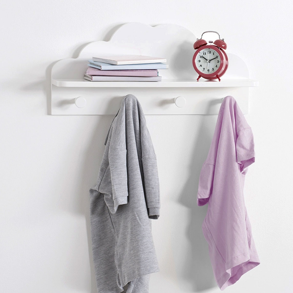 Κρεμάστρα τοίχου με 4 άγκιστρα για να είναι πάντα τακτοποιημένο το δωμάτιο του παιδιού σας. Είναι κατασκευασμένο από ξύλο MDF σε λευκό χρώμα. Έχει σχήμα σύννεφου και ένα ραφάκι για τοποθετήσετε διακοσμητικά αντικείμενα. *Το προϊόν έρχεται αμοντάριστο και συναρμολογείται βάσει οδηγιών.*