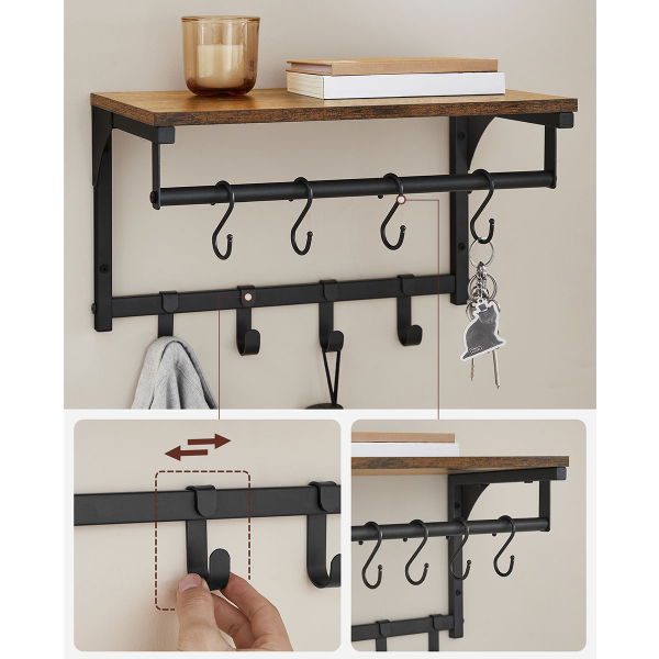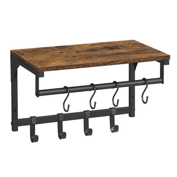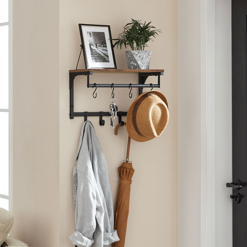 Κρεμάστρα τοίχου με ράφι και μοντέρνο σχεδιασμό από την εταιρεία Vasagle. Είναι κατασκευασμένη από μοριοσανίδα σε καφέ ρουστίκ χρώμα και έχει μαύρο μεταλλικό σκελετό. Έχει 8 άγκιστρα για να κρεμάτε τα παλτό, τα κασκόλ, τις τσάντες ή ότι άλλο θέλετε. Στη κορυφή της έχει ράφι όπου μπορείτε να διακοσμήσετε με μικροαντικείμενα. Διαθέτει μια ράγα για να κρεμάσετε τα παλτό σας με κρεμάστρες η οποία έχει μέγιστο βάρος αντοχής 9kg. Ιδανική για να τοποθετηθεί στην είσοδο, το υπνοδωμάτιο ή όπου αλλού σας είναι απαραίτητη. Μέγιστο βάρος αντοχής ανά κρεμαστράκι: 2.3kg. Μέγιστο βάρος αντοχής ραφιού 15.9kg. *Το προϊόν έρχεται αμοντάριστο και συναρμολογείται βάσει οδηγιών.*