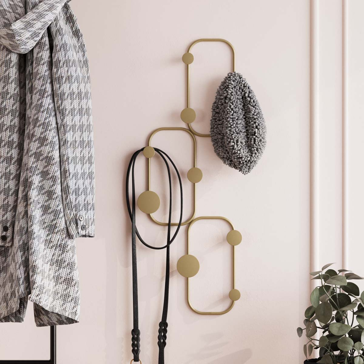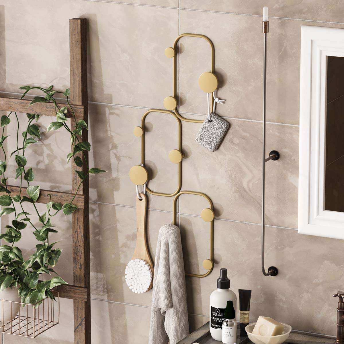 Κρεμάστρα τοίχου με 9 άγκιστρα σε χρυσό χρώμα και μοντέρνο σχέδιο, κατασκευασμένη από μέταλλο. Ιδανική για την είσοδο, το χωλ ή την κρεβατοκάμαρα. Τοποθετείται με βίδες στον τοίχο. Μέγιστο βάρος αντοχής: 10kg