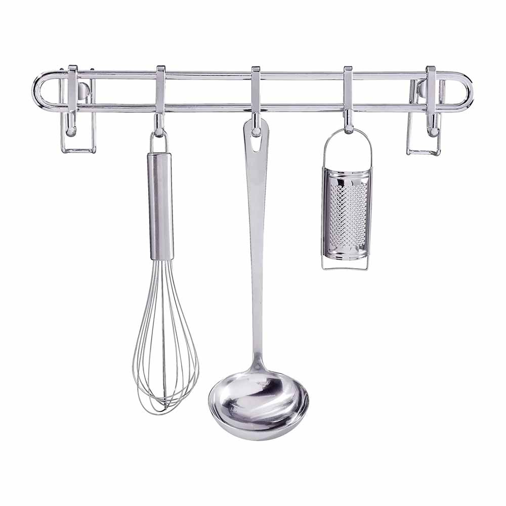 Κρεμάστρα για τα εργαλεία κουζίνας της γερμανικής εταιρείας Wenko ώστε να είναι πάντα προσιτά κατά το μαγείρεμα. Έχει όμορφη εμφάνιση από γυαλιστερό, επιχρωμιωμένο μέταλλο. Διαθέτει 5 άγκιστρα για κουτάλες, σπάτουλες, σύρμα, ψαλίδι κλπ. Συμπεριλαμβάνονται οι βίδες τοποθέτησης. Αυτό το ράφι κουζίνας θα γίνει χρήσιμος βοηθός σε κάθε κουζίνα.