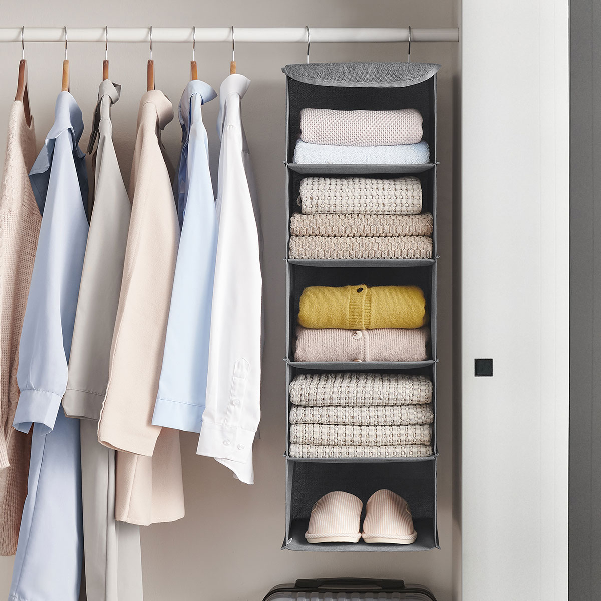 Θήκη για την οργάνωση ντουλάπας από την εταιρεία Songmics. Είναι κατασκευασμένη από γκρι ύφασμα non-woven. Διαθέτει μεταλλικό σκελετό και μεταλλικούς γάντζους για να κρεμιέται στη ράγα της ντουλάπας. Διαθέτει 5 θέσεις και μπορείτε πέρα από ρούχα, φουλάρια, κασκόλ, τσάντες κλπ να τοποθετήσετε 5 ζευγάρια παπούτσια. Όταν δεν χρησιμοποιείται, μπορεί να διπλωθεί και να αποθηκευτεί για εξοικονόμηση χώρου. Μέγιστο βάρος αντοχής ανά θήκη: 2kg.