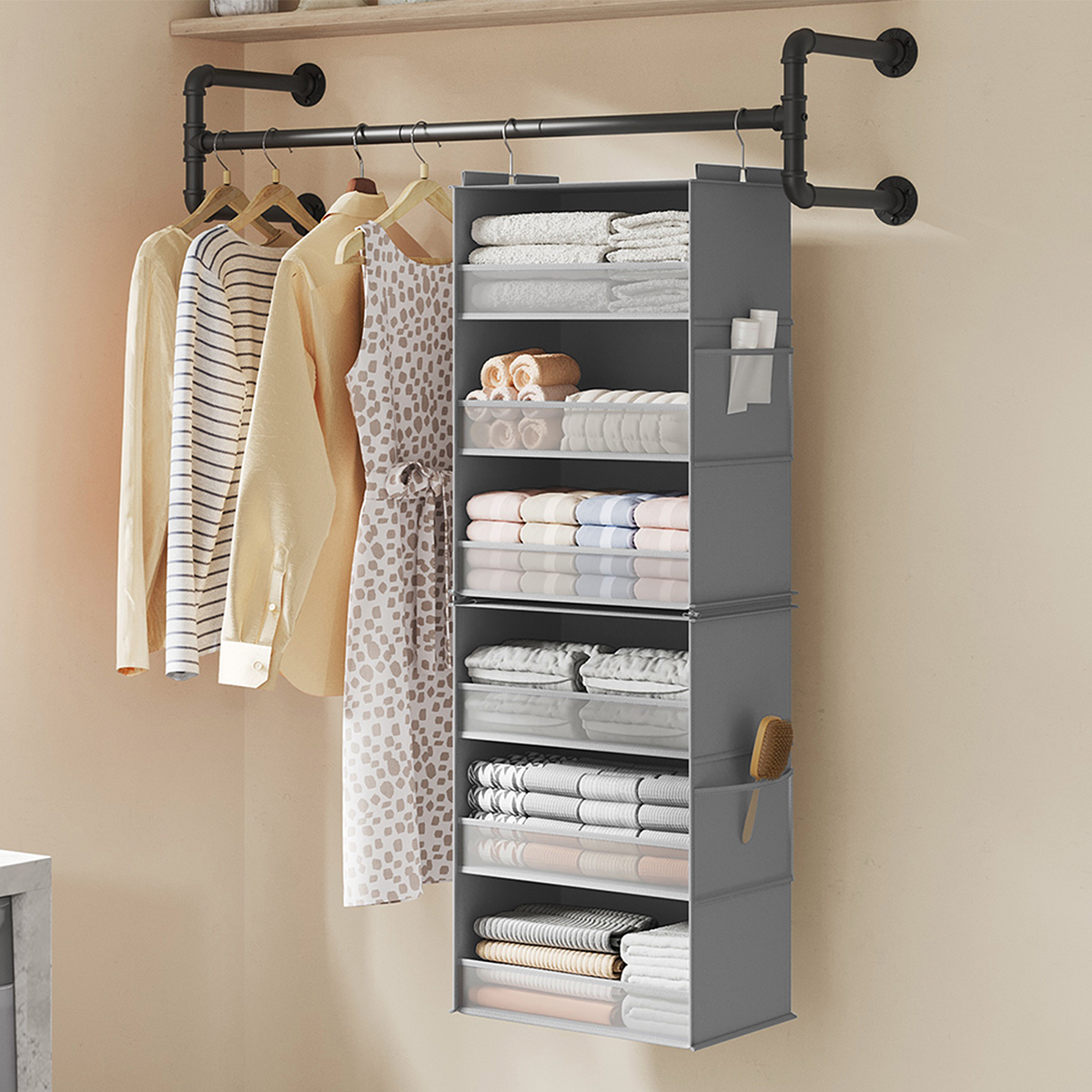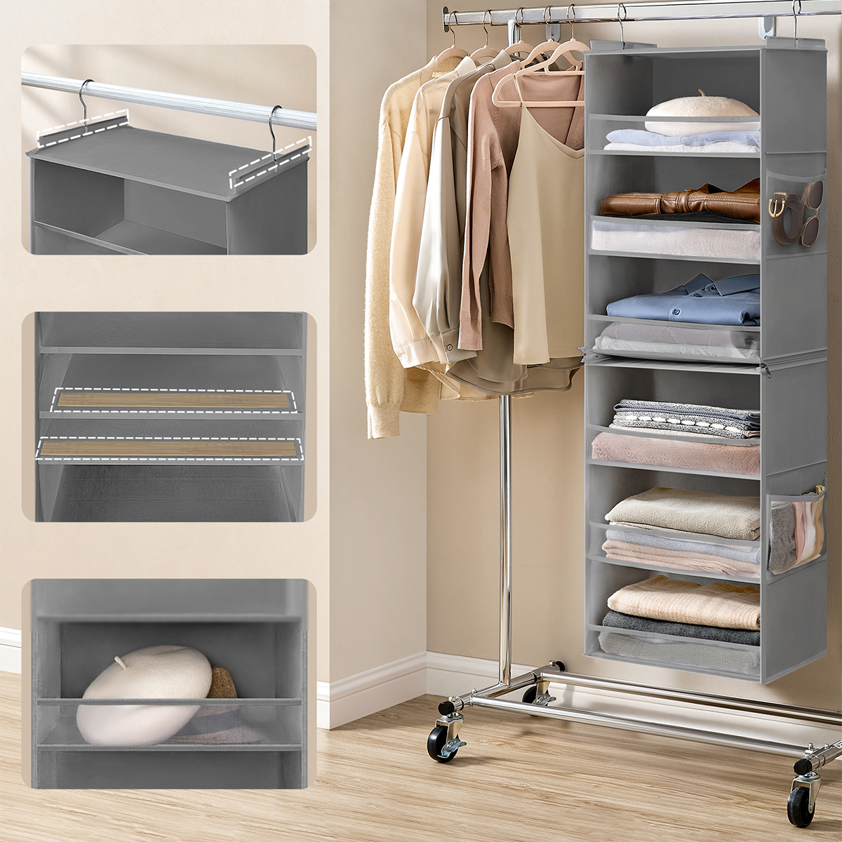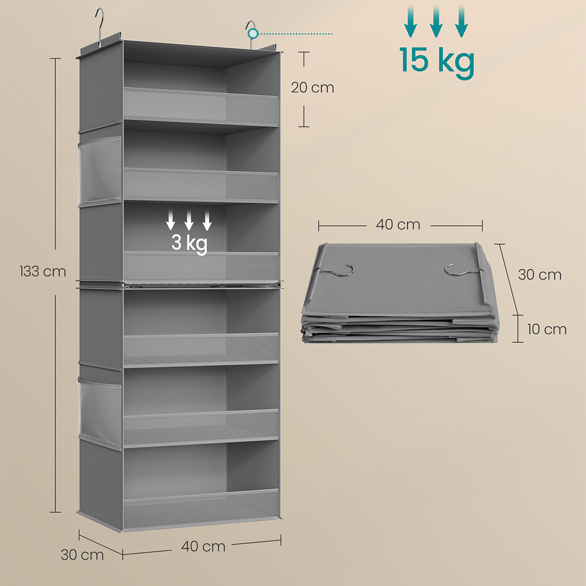 Θήκη οργάνωσης ντουλάπας από την εταιρεία Songmics. Είναι κατασκευασμένη από γκρι ύφασμα non-woven ενώ οι θήκες εσωτερικά διαθέτουν χαρτόνι για να διατηρούν το σχήμα τους. Διαθέτει 6 θέσεις που μπορείτε να αποθηκεύσετε τα μικροπράγματα σας. Στη μέση έχει φερμουάρ που σας επιτρέπει να χωρίσετε την θήκη σε 2 θήκες 3 θέσεων. Όταν δεν χρησιμοποιείται, μπορεί να διπλωθεί και να αποθηκευτεί για εξοικονόμηση χώρου. Μέγιστο βάρος αντοχής ανά θέση: 3kg. Συνολικό μέγιστο βάρος αντοχής: 18kg