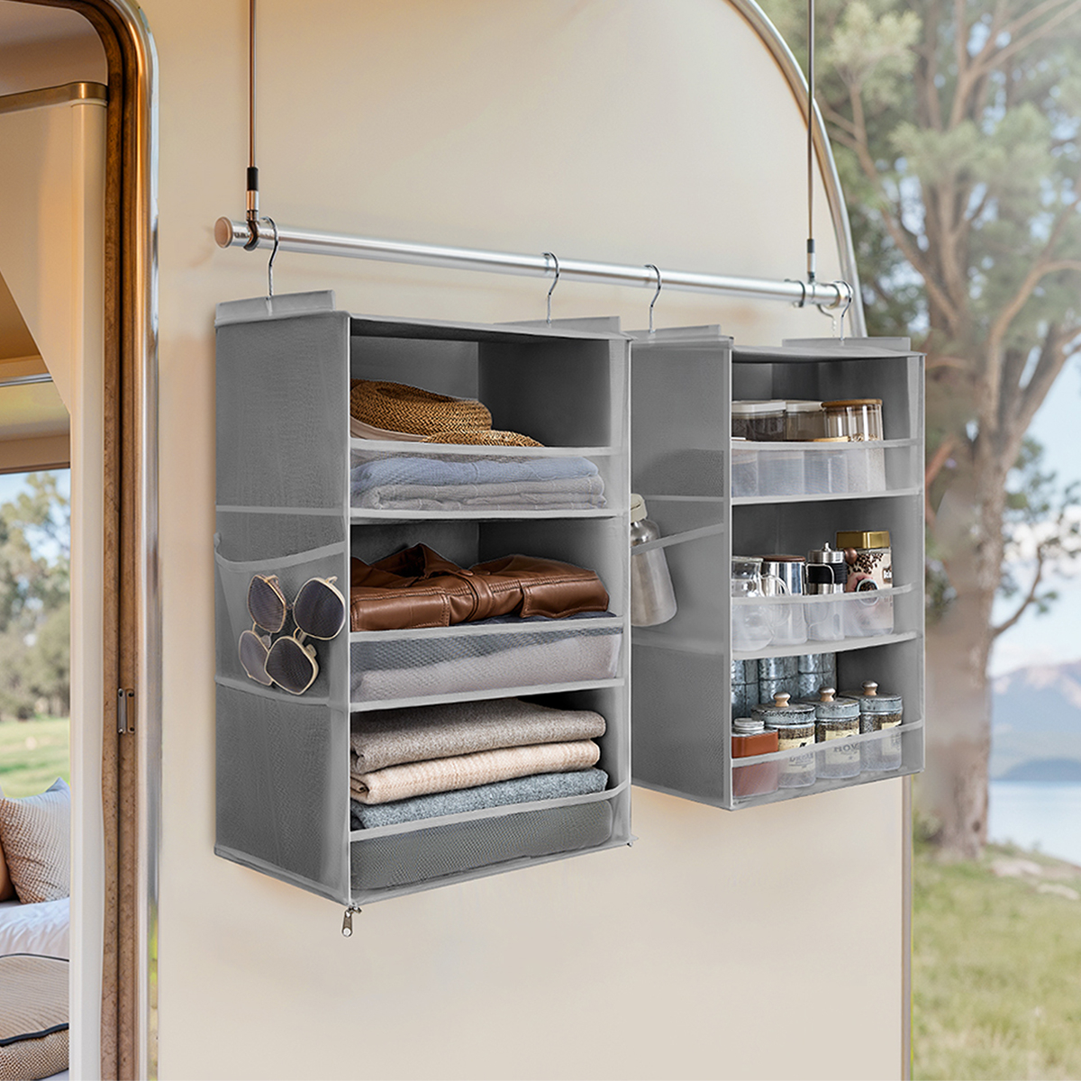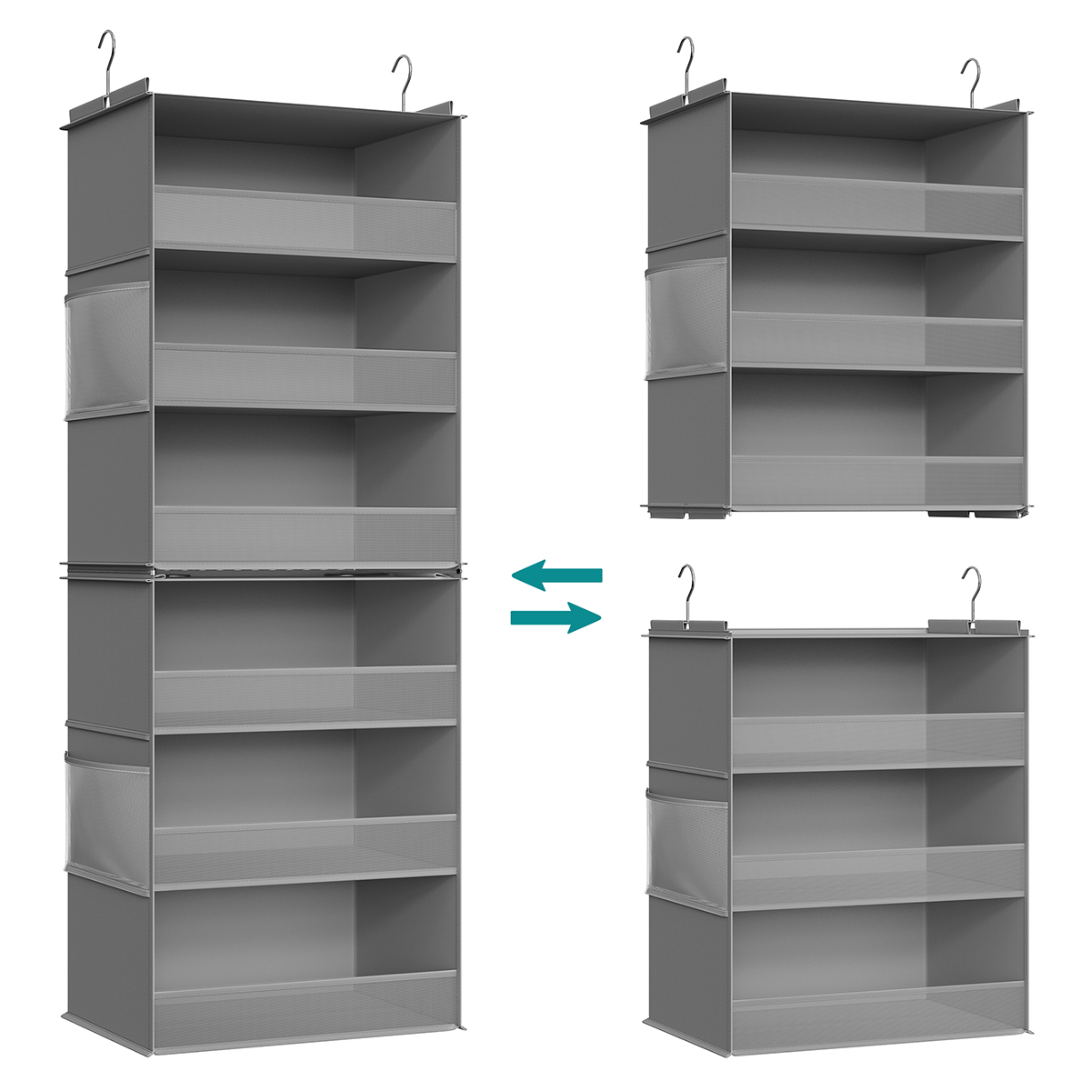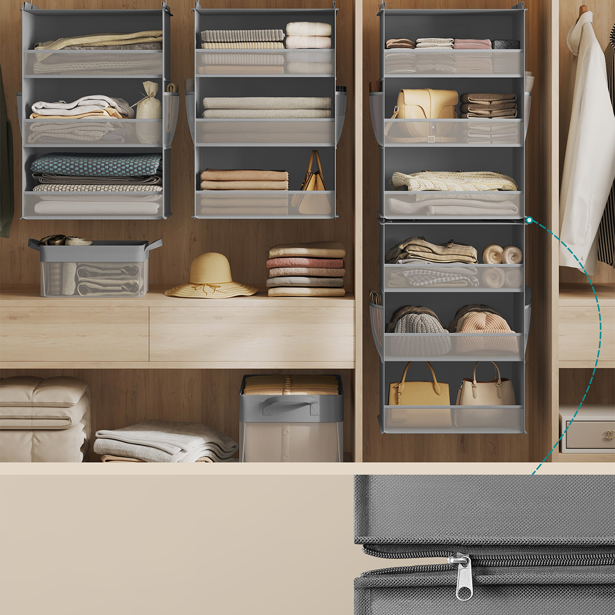 Θήκη οργάνωσης ντουλάπας από την εταιρεία Songmics. Είναι κατασκευασμένη από γκρι ύφασμα non-woven ενώ οι θήκες εσωτερικά διαθέτουν χαρτόνι για να διατηρούν το σχήμα τους. Διαθέτει 6 θέσεις που μπορείτε να αποθηκεύσετε τα μικροπράγματα σας. Στη μέση έχει φερμουάρ που σας επιτρέπει να χωρίσετε την θήκη σε 2 θήκες 3 θέσεων. Όταν δεν χρησιμοποιείται, μπορεί να διπλωθεί και να αποθηκευτεί για εξοικονόμηση χώρου. Μέγιστο βάρος αντοχής ανά θέση: 3kg. Συνολικό μέγιστο βάρος αντοχής: 18kg