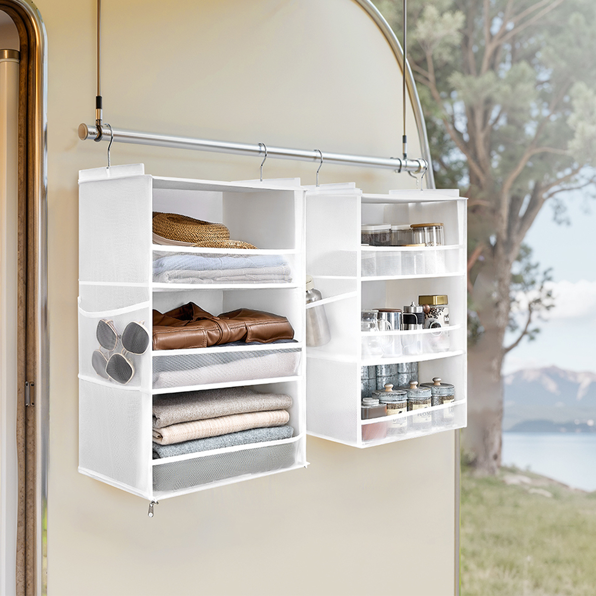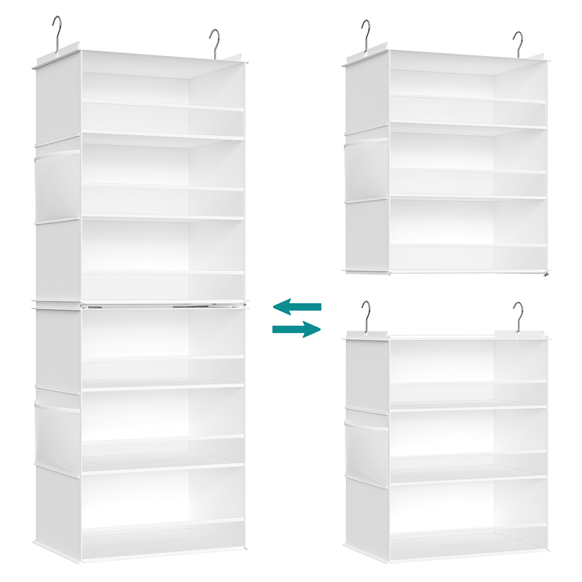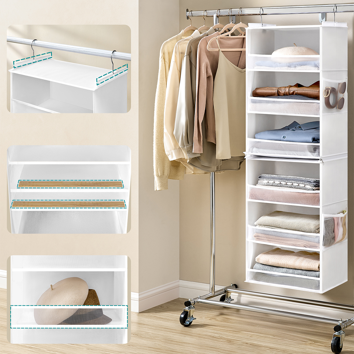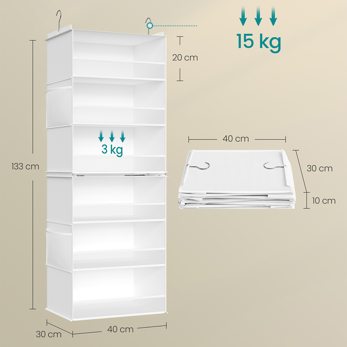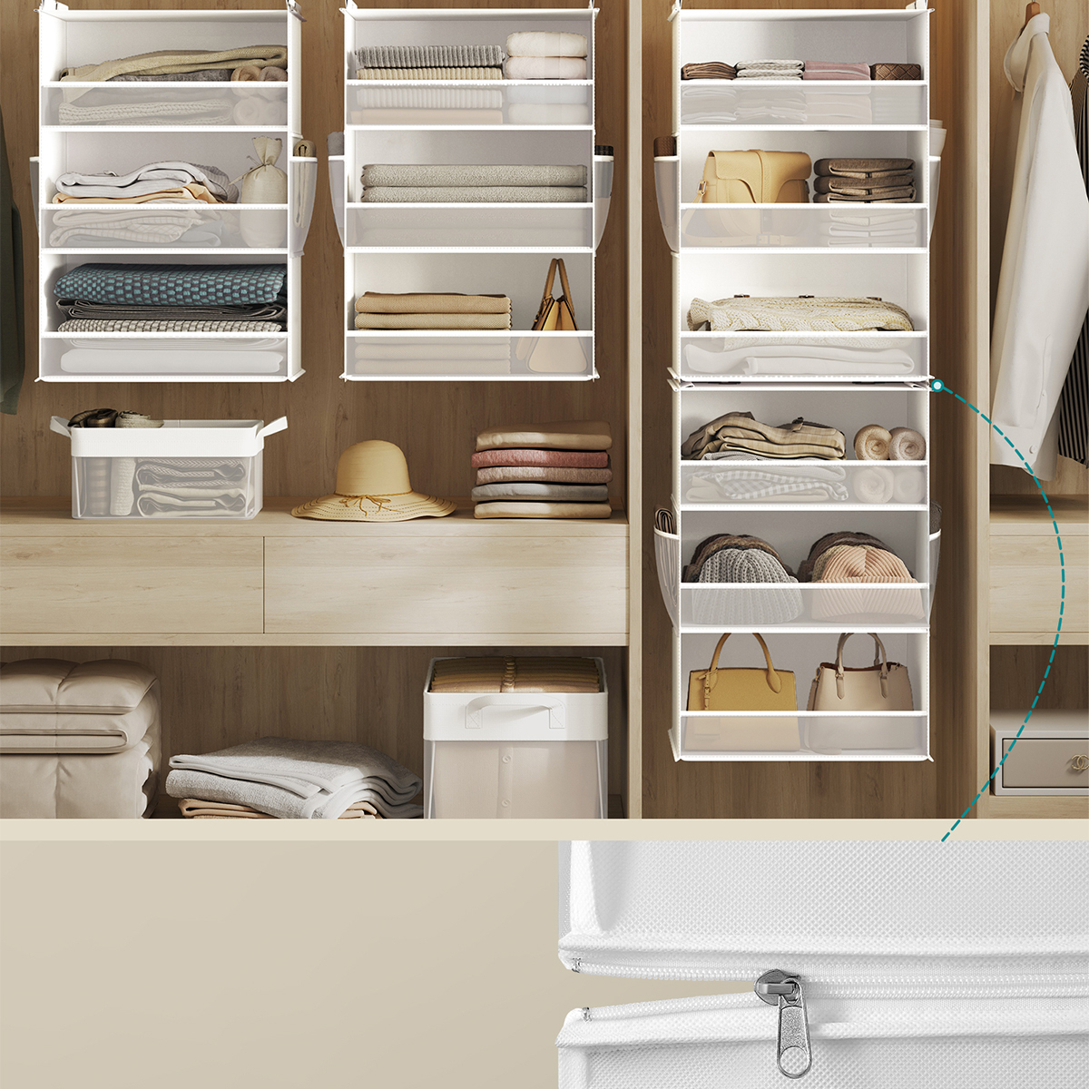 Θήκη οργάνωσης ντουλάπας από την εταιρεία Songmics. Είναι κατασκευασμένη από λευκό ύφασμα non-woven ενώ οι θήκες εσωτερικά διαθέτουν χαρτόνι για να διατηρούν το σχήμα τους. Διαθέτει 6 θέσεις που μπορείτε να αποθηκεύσετε τα μικροπράγματα σας. Στη μέση έχει φερμουάρ που σας επιτρέπει να χωρίσετε την θήκη σε 2 θήκες 3 θέσεων. Όταν δεν χρησιμοποιείται, μπορεί να διπλωθεί και να αποθηκευτεί για εξοικονόμηση χώρου. Μέγιστο βάρος αντοχής ανά θέση: 3kg. Συνολικό μέγιστο βάρος αντοχής: 18kg