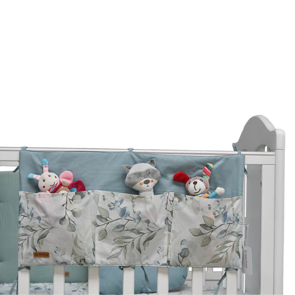 Κρεμαστή θήκη οργάνωσης με φλοράλ σχέδιο σε γαλάζιες-πράσινες αποχρώσεις από την εταιρεία Bebe Stars. Δένει με κορδονάκια στο κάγκελο της κούνιας και διαθέτει 3 θήκες 19.5x19 για να αποθηκεύσετε πάνες, μωρομάντηλα ή ότι άλλο θέλετε για να διατηρήσετε το βρεφικό δωμάτιο τακτοποιημένο.