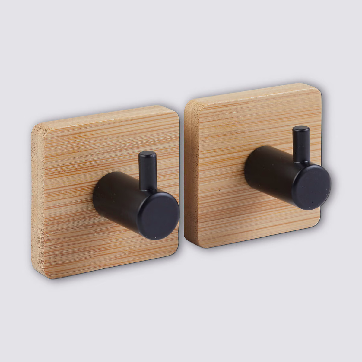 Κρεμαστράκια τοίχου με αυτοκόλλητο σε σετ 2 τεμαχίων και μοντέρνο σχεδιασμό. Είναι κατασκευασμένα από ξύλο bamboo σε μπεζ χρώμα και διαθέτουν μαύρα άγκιστρα από ανοξείδωτο ατσάλι. Ιδανικά για το μπάνιο, την κουζίνα ή όπου σας είναι απαραίτητα για εγκατάσταση χωρίς τρύπημα. Με πιστοποίηση FSC. Μέγιστο βάρος αντοχής ανά κρεμαστράκι: 1.5kg.