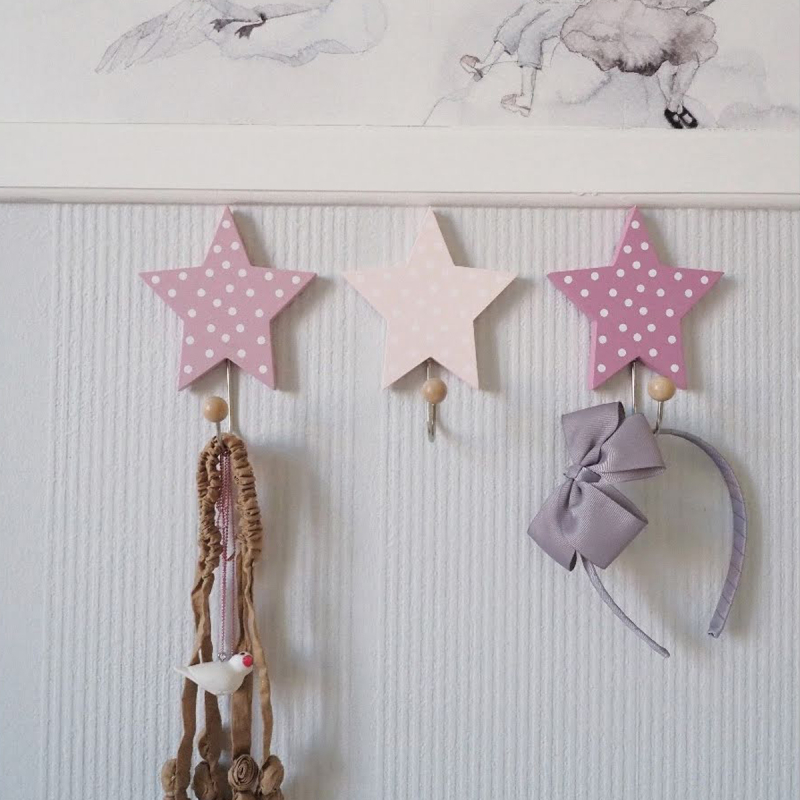Κρεμαστράκια τοίχου της σουηδικής εταιρείας Jabadabado σε ροζ αποχρώσεις και σχήμα αστεριών. Είναι κατασκευασμένα από ξύλο με μεταλλικές λεπτομέρειες και τοποθετούνται στον τοίχο. Διακοσμούν μοναδικά ενώ ταυτόχρονα αποθηκεύουν ρούχα, σακίδια και ότι άλλο επιθυμείτε για να διατηρήσετε το δωμάτιο τακτοποιημένο. Ιδανικά για κοριτσάκια. Τοποθετείτε στον τοίχο με βίδα ή καρφί (τα υλικά τοποθέτησης δεν περιλαμβάνονται).