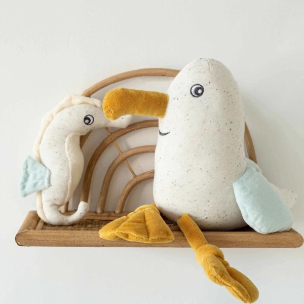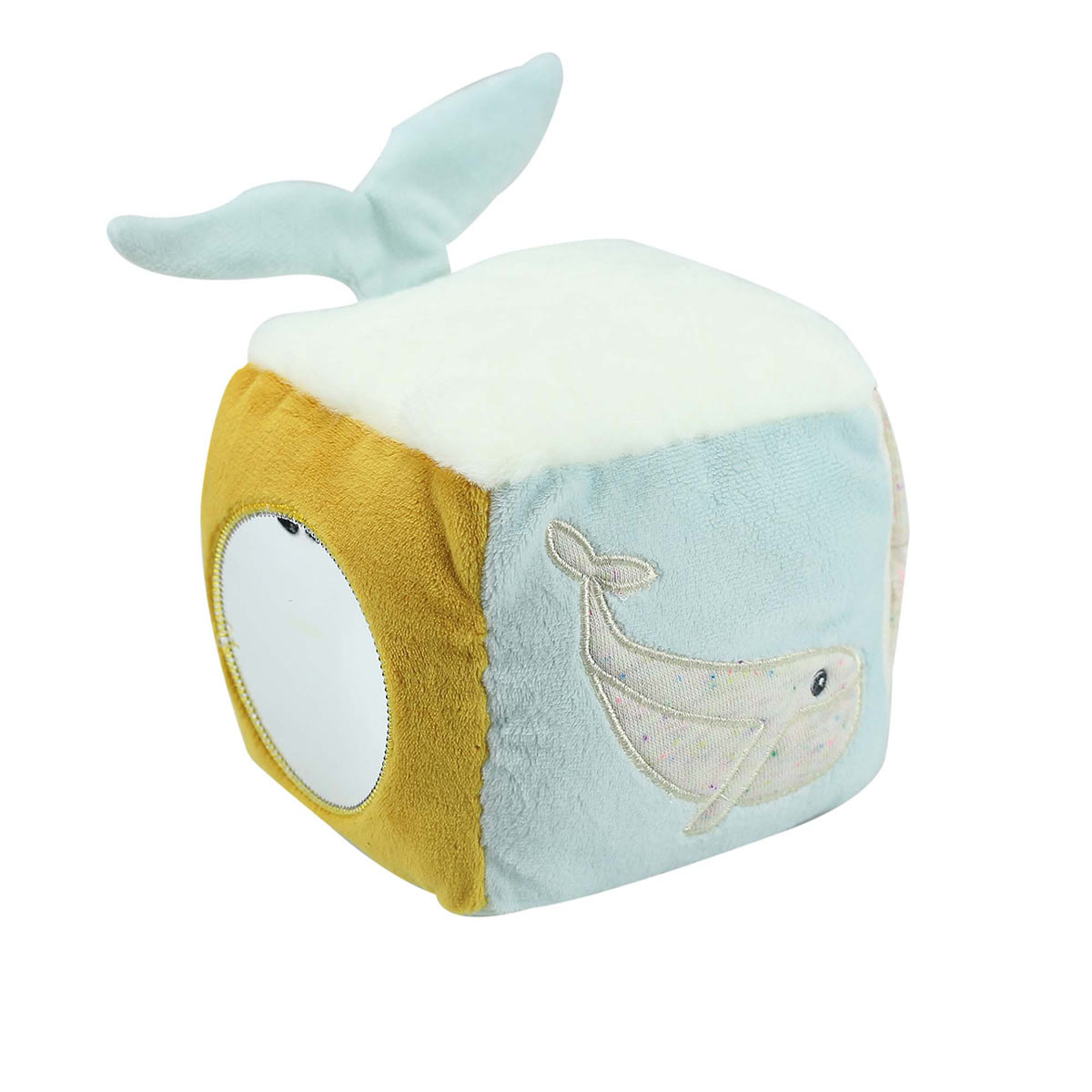 Κύβος δραστηριότητας σε γαλάζιο-μουσταρδί χρώμα με εκρού-γκρι λεπτομέρειες της εταιρείας Trois Kilos Sept. Με βελουτέ ύφασμα από 100% polyester και γέμιση από μαλακή βάτα.. Έχει πολλές υφές που διεγείρουν τις αισθήσεις και βοηθούν στην εξέλιξη της κινητικότητας. Διαθέτει καθρέπτη και παράγει ήχους αγγίζοντας τον γλάρο ή την φάλαινα. Κατάλληλο από την γέννηση.