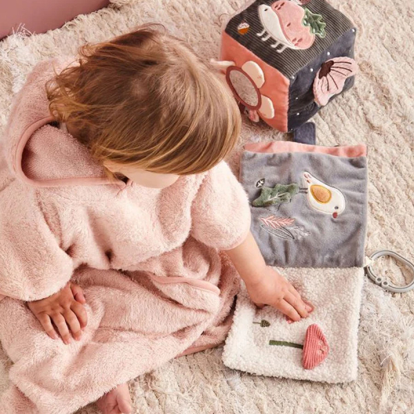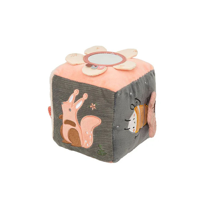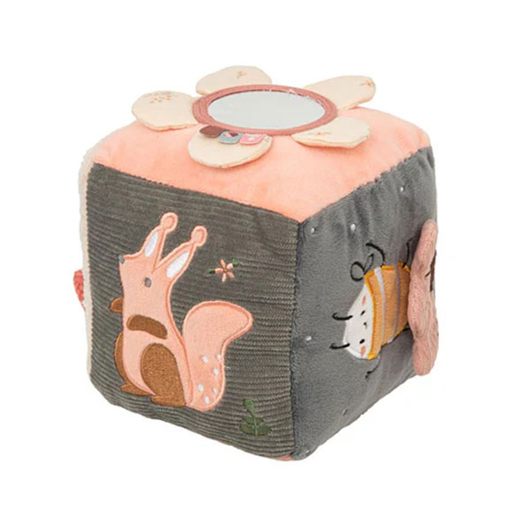 Κύβος δραστηριότητας της εταιρείας Bimbidreams σε γκρι-ροζ χρώμα με ζωάκια στο σχέδιο. Κατασκευασμένο από 100% βαμβάκι. Έχει πολλές υφές που διεγείρουν τις αισθήσεις και βοηθούν στην εξέλιξη της κινητικότητας. Διαθέτει καθρέπτη που θα του κινήσει την περιέργεια και θα τον βοηθήσει να ανακαλύψει τον εαυτό του. Κατάλληλο από την γέννηση.