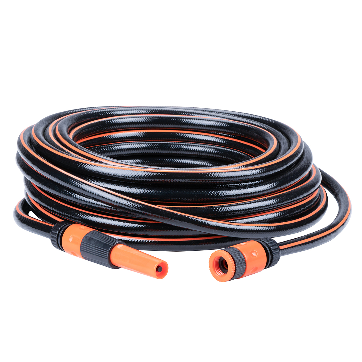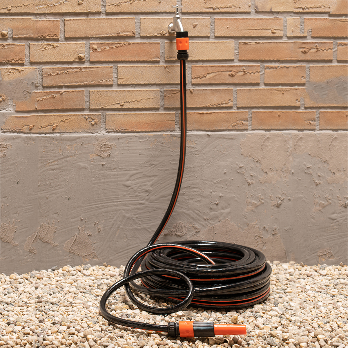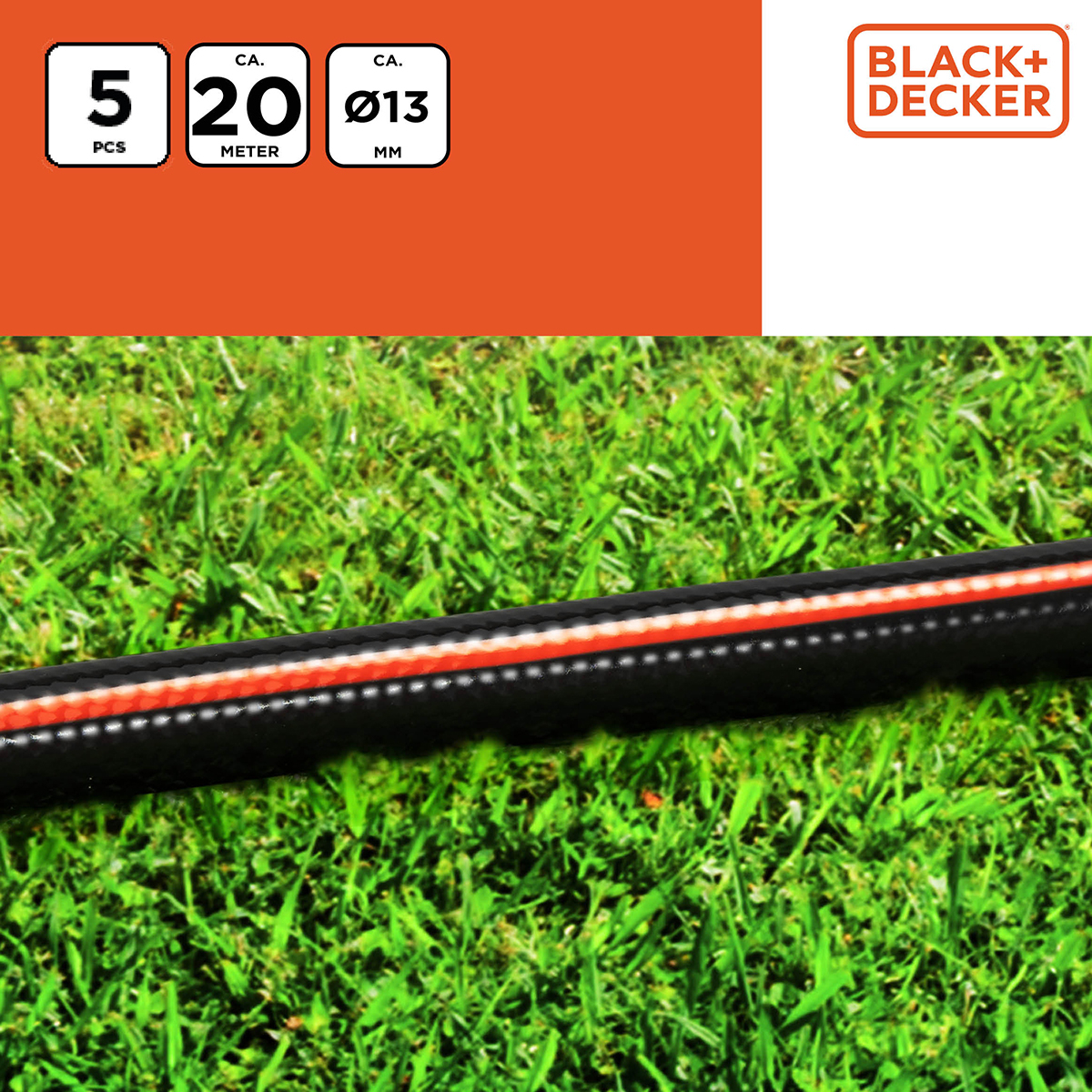 Εύκαμπτο λάστιχο ποτίσματος μήκους 20 μέτρων από την εταιρεία Black+Decker. Είναι κατασκευασμένο από PVC σε μαύρο χρώμα με πορτοκαλί λεπτομέρειες, το οποίο είναι ανθεκτικό στην υπεριώδη ακτινοβολία. Μπορεί να αντέξει πίεση έως 6bar. Διαθέτει εξάρτημα ποτίσματος και ταχυσύνδεσμο για βρύση.