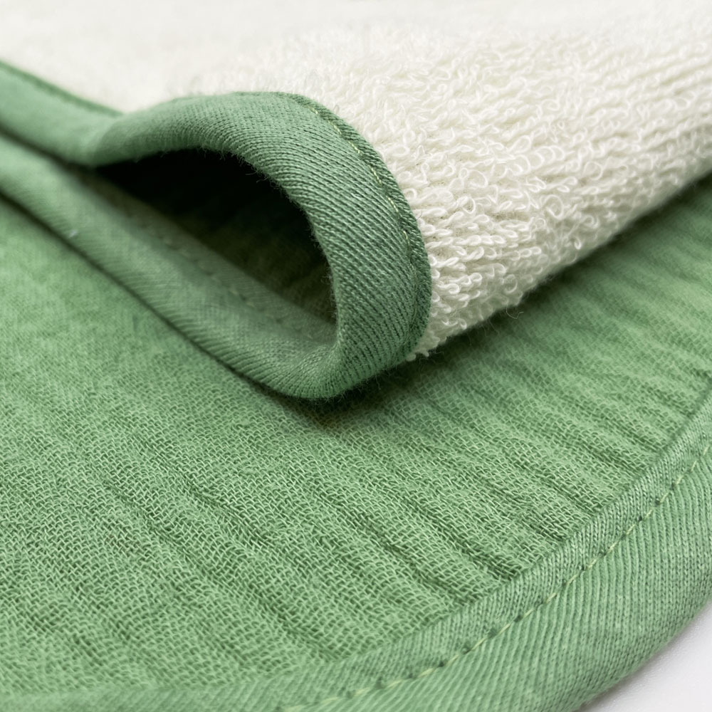Λαβέτες ώμου σετ από την εταιρεία Smikkels. Το ύφασμα τους είναι 100% οργανικό βαμβάκι που δεν ερεθίζει το δέρμα του μωρού. Το μπροστινό μέρος είναι κατασκευασμένο από υδρόφιλο βαμβάκι μουσελίνα και έχει πράσινο χρώμα. Το πίσω μέρος από μαλακό βαμβακερό ύφασμα πετσετέ σε εκρού χρώμα. Είναι πολύ απαλές στην υφή και εξαιρετικά απορροφητικές. Είναι ιδανικές για να σκουπίσετε απαλά το βρεφικό δέρμα μετά από το γεύμα ή να τις βάλετε στον ώμο σας για να ρευτεί το μωρό.