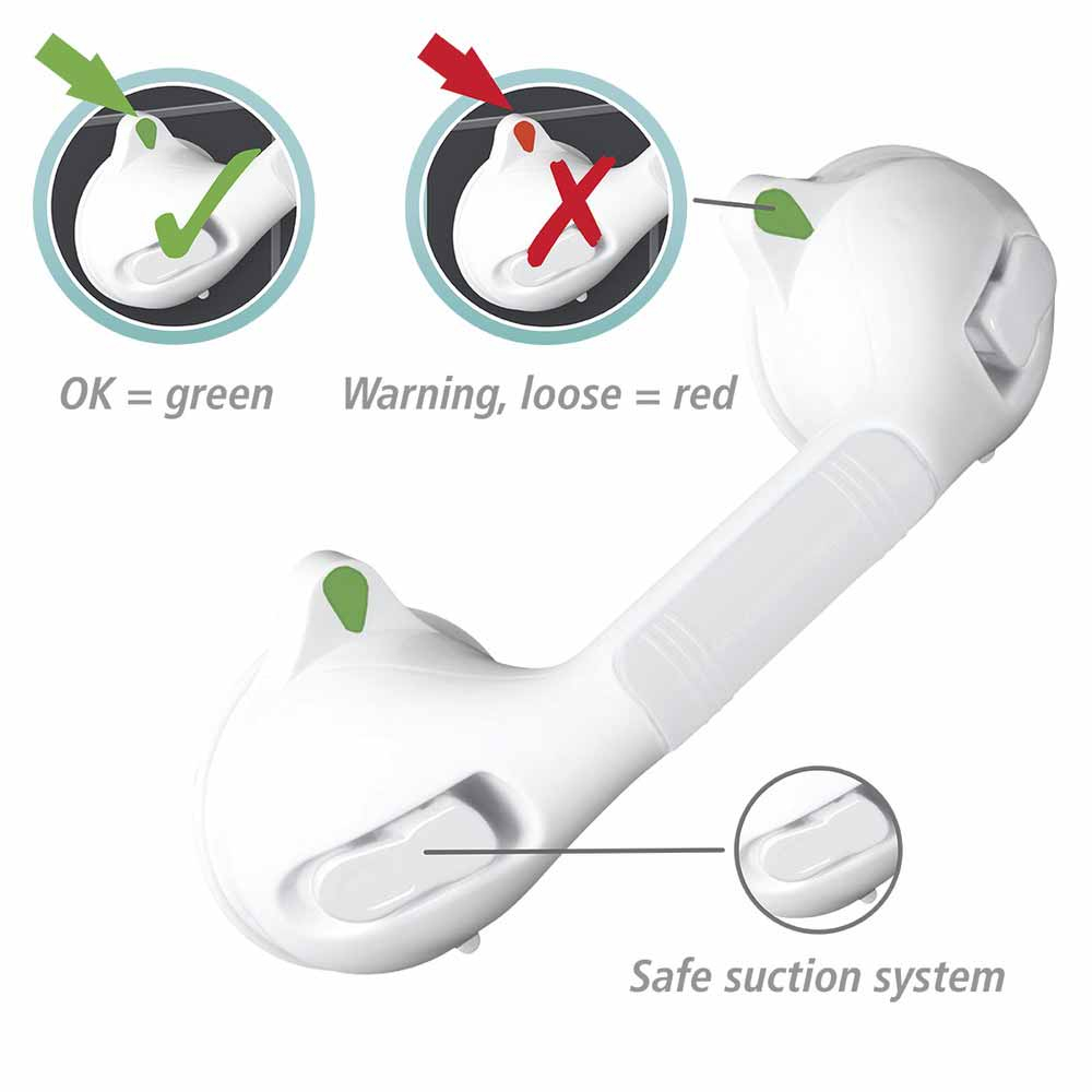 Λαβή ασφαλείας για τον τοίχο της σειράς Secura από την γερμανική εταιρεία Wenko. Είναι κατασκευασμένη από υψηλής ποιότητας ανθεκτικό πλαστικό σε λευκή απόχρωση. Χαρίζει σταθερό κράτημα χάρη σε ένα ασφαλές σύστημα αναρρόφησης, που είναι εύκολο στην τοποθέτηση και την αφαίρεση απλά πατώντας το κουμπί αναρρόφησης και γυρίζοντας το μοχλό. Διαθέτει σηματοδότη για την σωστή αναρρόφησης: Α) το πράσινο χρώμα σημαίνει ότι είναι εντάξει η αναρρόφηση, Β) το κόκκινο χρώμα υποδηλώνει προσοχή καθώς είναι χαλαρή η αναρρόφηση και ότι η λαβή δεν είναι καλά στερεωμένη. Η λαβή αυτή είναι κατάλληλη για χρήση στον νιπτήρα, στην τουαλέτα, στην μπανιέρα, στην ντουζιέρα, κλπ. Ενδείκνυται για λείες επιφάνειες και αδιαπέραστες από τον αέρα, και όχι για σαγρέ επιφάνειες. Δεν χρειάζεται τρύπημα στον τοίχο ή τα πλακάκια.