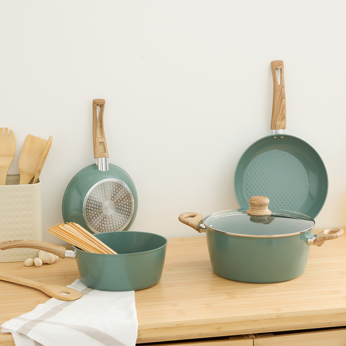 Σετ μαγειρικά σκεύη, κατασκευασμένα από σφυρήλατο αλουμίνιο σε χακί χρώμα με μπεζ λαβές. Το σφυρήλατο αλουμίνιο είναι ελαφρύ, ανθεκτικό και ευέλικτο στη χρήση. Ζεσταίνεται γρήγορα, ανταποκρίνεται άμεσα στις αλλαγές θερμοκρασίας και προσφέρει άνεση στο καθημερινό μαγείρεμα με αξιοπιστία και ευκολία. Το σετ περιλαμβάνει: 2 τηγάνια, 1 κατσαρόλα, 1 κατσαρολάκι γάλακτος, 1 καπάκι και 1 βάση/σουπλά μαγειρικών σκευών. Διαθέτουν εργονομικές λαβές με εφέ ξύλου για εύκολη και ασφαλή μεταφορά. Ιδανικά για υγιεινό μαγείρεμα και τέλειο ψήσιμο. Συνιστάται πλύσιμο στο χέρι.