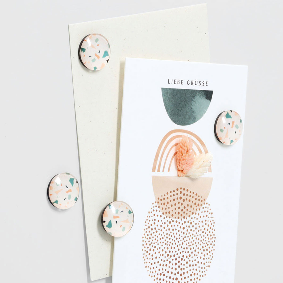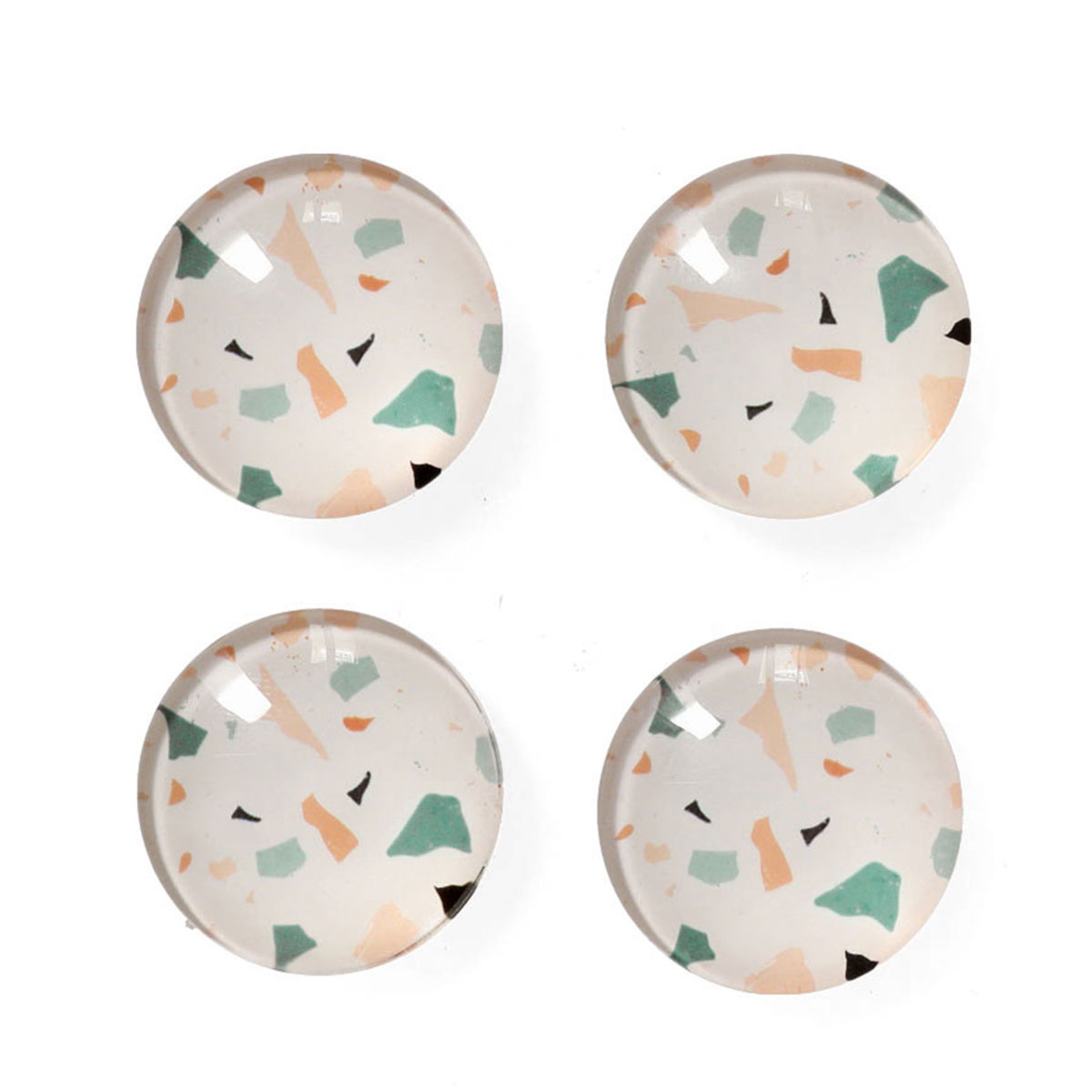Μαγνητάκια σε σετ 4 τεμαχίων, με μοντέρνο μοτίβο terrazzo. Είναι κατασκευασμένα από πλαστικό υλικό με πολύχρωμο σχέδιο σε λευκό φόντο. Ιδανικά για να συγκρατούν σημειώσεις, φωτογραφίες και υπενθυμίσεις στο ψυγείο ή σε μεταλλικές επιφάνειες. Με κομψό σχεδιασμό και διακριτικούς χρωματικούς συνδυασμούς, προσθέτουν μια σύγχρονη διακοσμητική πινελιά στην κουζίνα ή το γραφείο, ενώ αποτελούν πρακτική λύση για την καθημερινή οργάνωση.