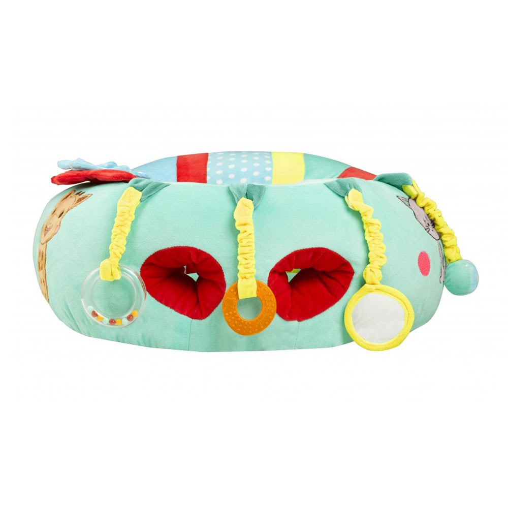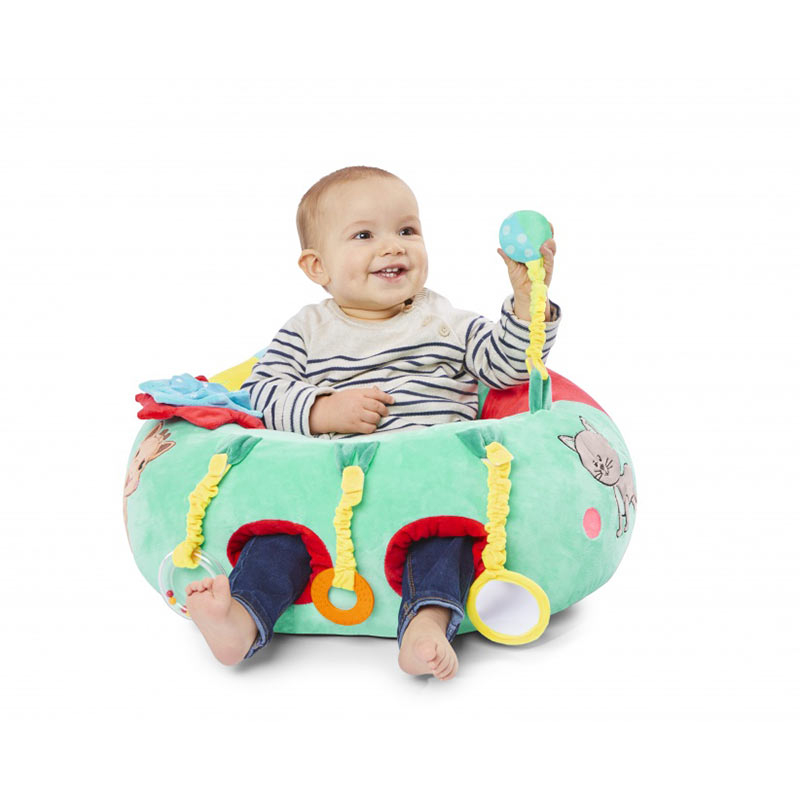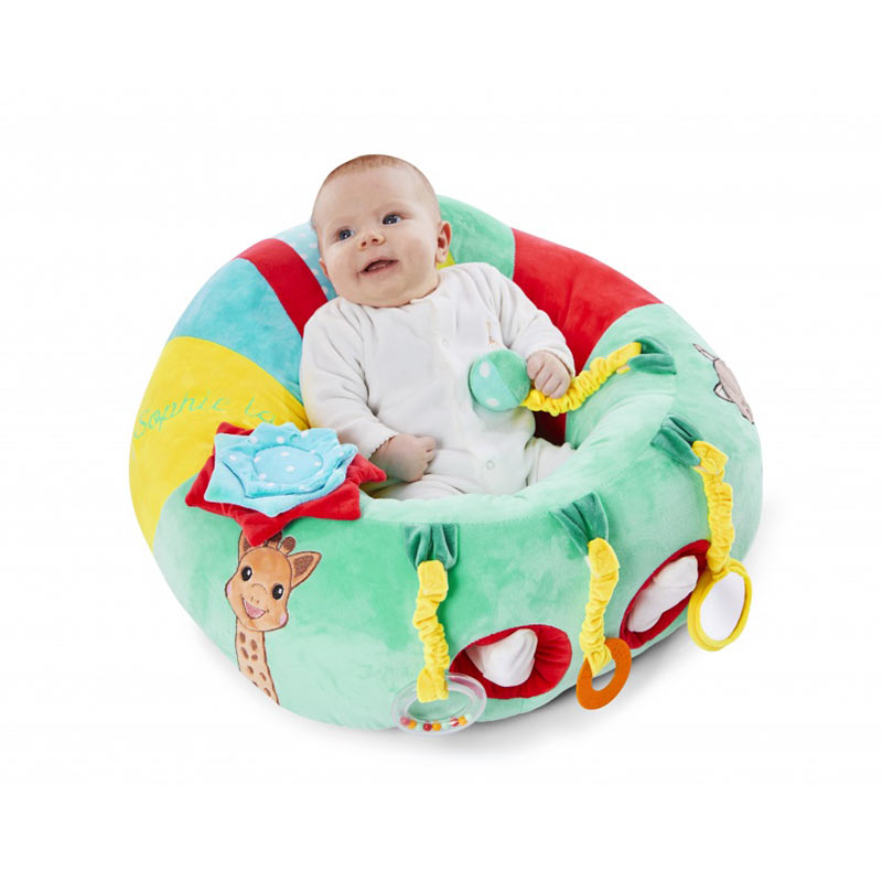 Καθισματάκι-μαξιλάρι δραστηριοτήτων από την Σόφι την καμηλοπάρδαλη. Συνδυάζει άνεση, διασκέδαση ενώ διεγείρει και τις 5 αισθήσεις του μωρού σας. Κατασκευασμένο από μαλακά και απαλά υφάσματα, με αντιολισθητική επένδυση στην βάση για να παραμένει σταθερό στην θέση του. Οι διάφορες υφές των υφασμάτων ενισχύουν την απτική ικανότητα του μωρού καθώς προκαλούν την περιέργειά του. Το μικρό κουδουνάκι, ο ήχος του τσαλακωμένου χαρτιού και η κουδουνίστρα δίνουν τα απαραίτητα ηχητικά ερεθίσματα για την ανάπτυξη της ακουστικής του ικανότητας. Διαθέτει δακτύλιο οδοντοφυΐας με γεύση βανίλια. Οι έντονες αντιθέσεις των χρωμάτων και ο περιλαμβανόμενος καθρέφτης ενισχύουν την όραση του παιδιού. Με αποσπώμενα παιχνίδια που μπορείνα έχει μαζί του όπου κι αν πάτε. Κατάλληλο για μωρά 3+ μηνών.