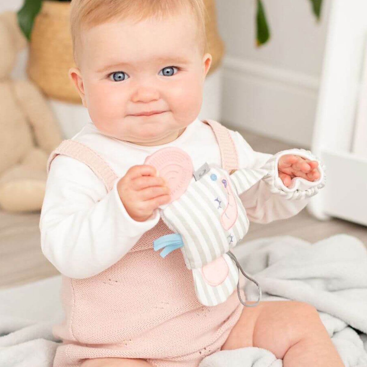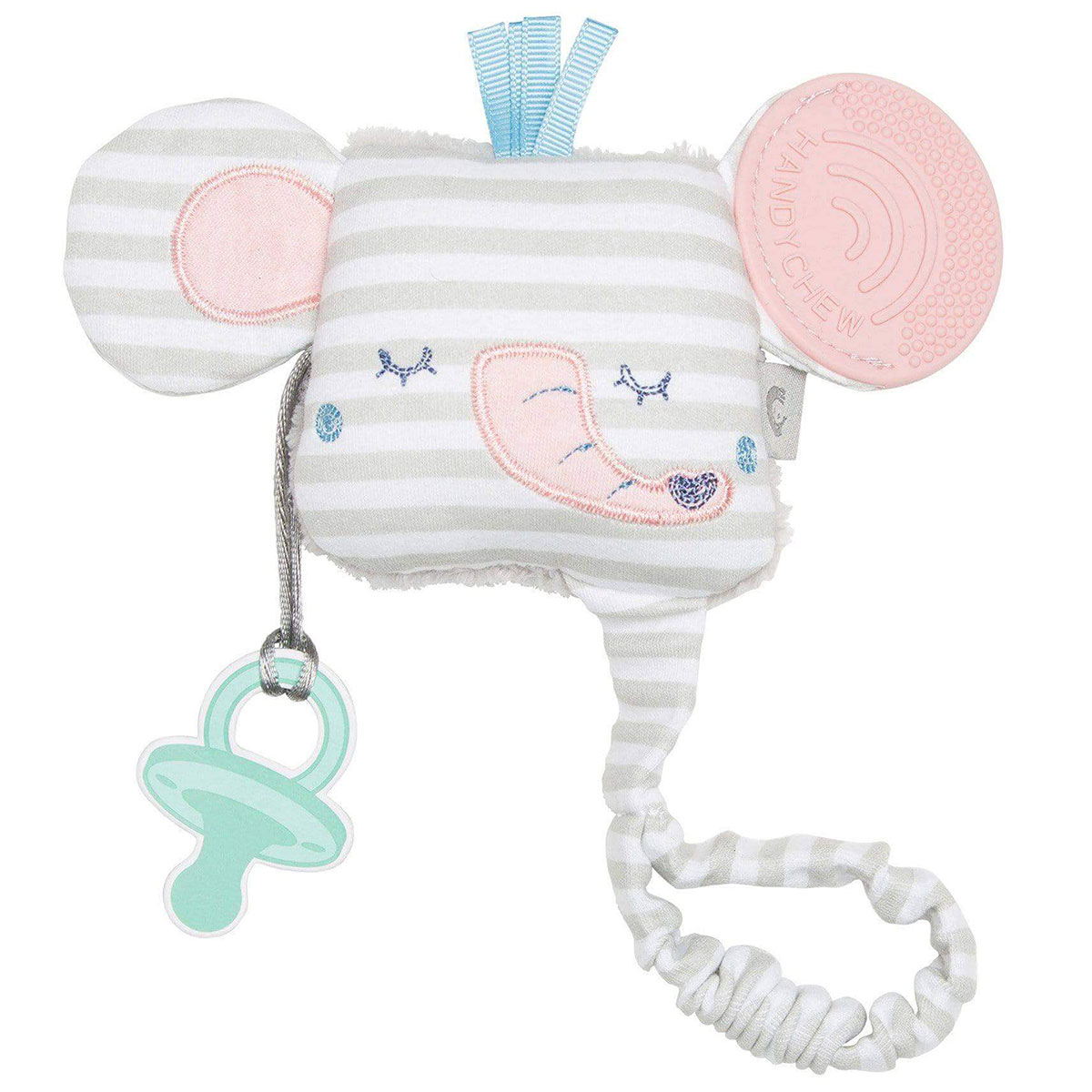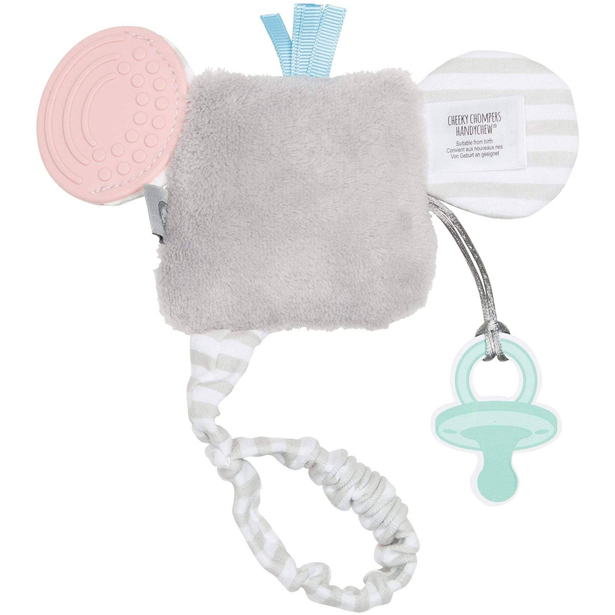 Μαλακό παιχνίδι με ήχο και ενσωματομένο μασητικό σε ροζ-γκρι χρώμα και σχέδιο ελεφαντάκι από την εταιρία Cheeky Chompers. Κατασκευασμένο από 100% βαμβάκι που το καθιστά μαλακό και ανθεκτικό. Το μασητικό είναι από 100% σιλικόνη κατάλληλη για τρόφιμα (εγκεκριμένη από τον FDA), χωρίς BPΑ ή φθαλικούς εστέρες απόλυτα ασφαλές για τα βρέφη. Το παιχνίδι αυτό διαθέτει πολλά αισθητηριακά χαρακτηριστικά, όπως μαλακές κορδέλες, ένα διασκεδαστικό τσαλακωμένο αυτί και κουδουνίστρα για να κρατάει το μωρό σας ενθουσιασμένο. Είναι σχεδιασμένο με προσαρτημένο λουράκι για στερέωση στον καρπό του μωρού ή στο καρότσι για να μην πέφτει και λερώνεται. Μια ιδανική λύση για να απασχολείται δημιουργικά το μωρό σας, αλλά παράλληλα και να ανακουφίζεται από τον πόνο των ούλων και των δοντιών. Καθαρίζεται εύκολα και πλένεται στο πλυντήριο. Είναι δοκιμασμένο με ασφάλεια σύμφωνα με τα υψηλότερα πρότυπα παγκοσμίως.