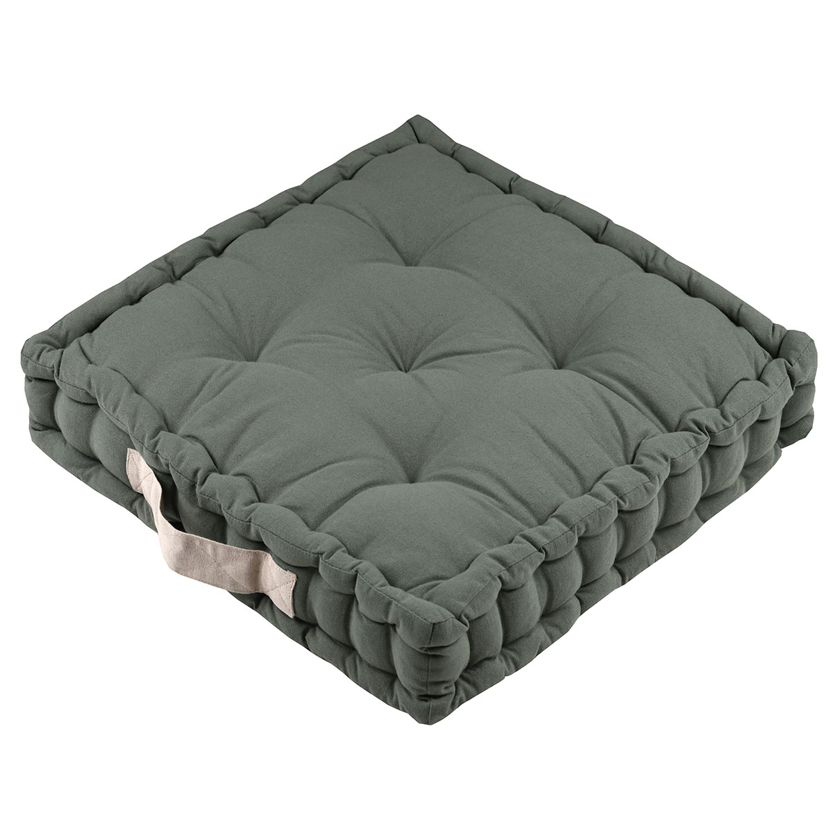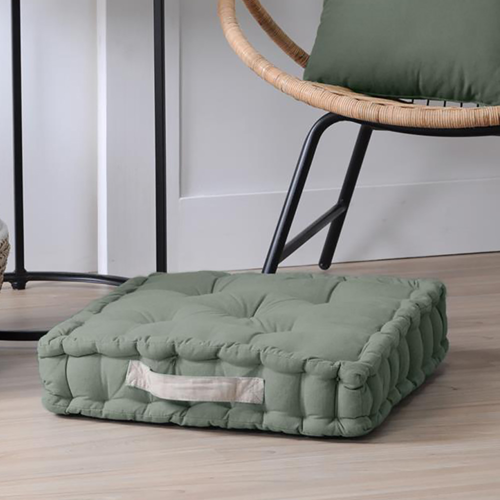 Μαξιλάρα δαπέδου μονόχρωμη σε χακί χρώμα. Το εξωτερικό ύφασμα είναι από 100% βαμβάκι ενώ το εσωτερικό γέμισμα πολυεστερική βάτα. Δεν διαθέτει φερμουάρ. Έχει χερούλι στο πλάι ώστε να μπορεί να μεταφερθεί με ευκολία. Δώστε μια αίσθηση χαλαρότητας και άνεσης στο χώρο σας, δημιουργώντας παράλληλα ένα έξτρα κάθισμα. Συνδυάστε το με τα υπόλοιπα είδη του ίδιου σετ για να δημιουργήστε ένα ξεχωριστό στυλ.