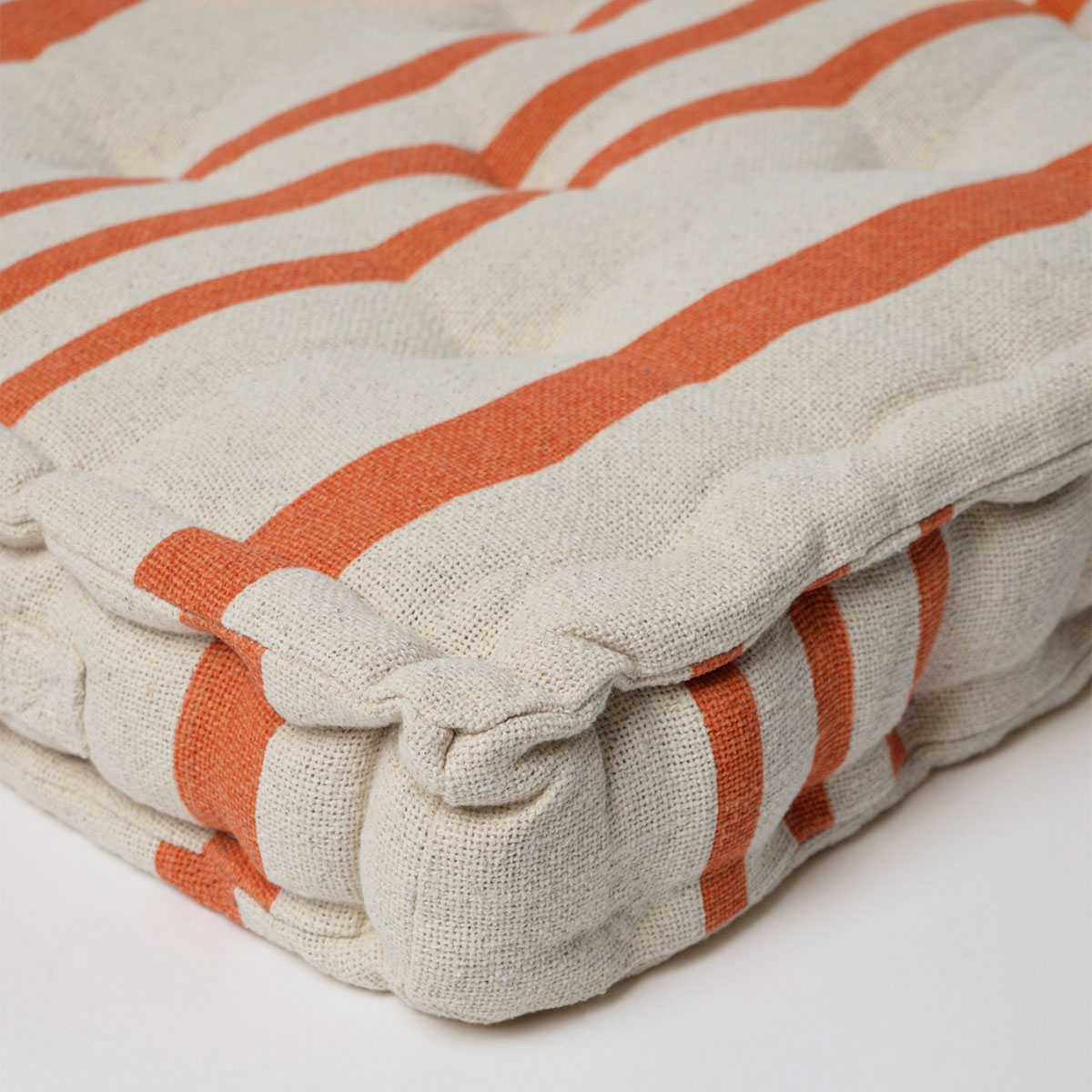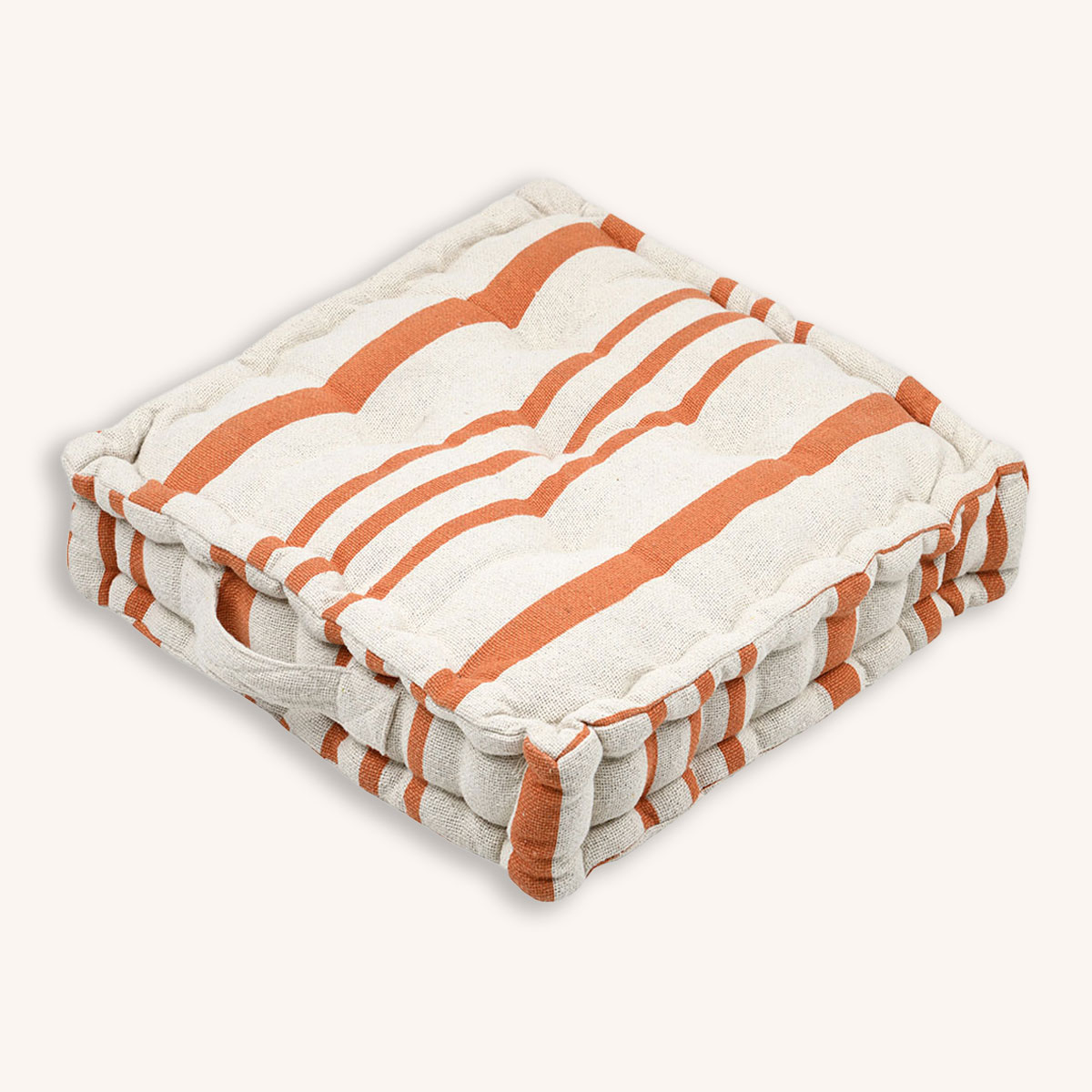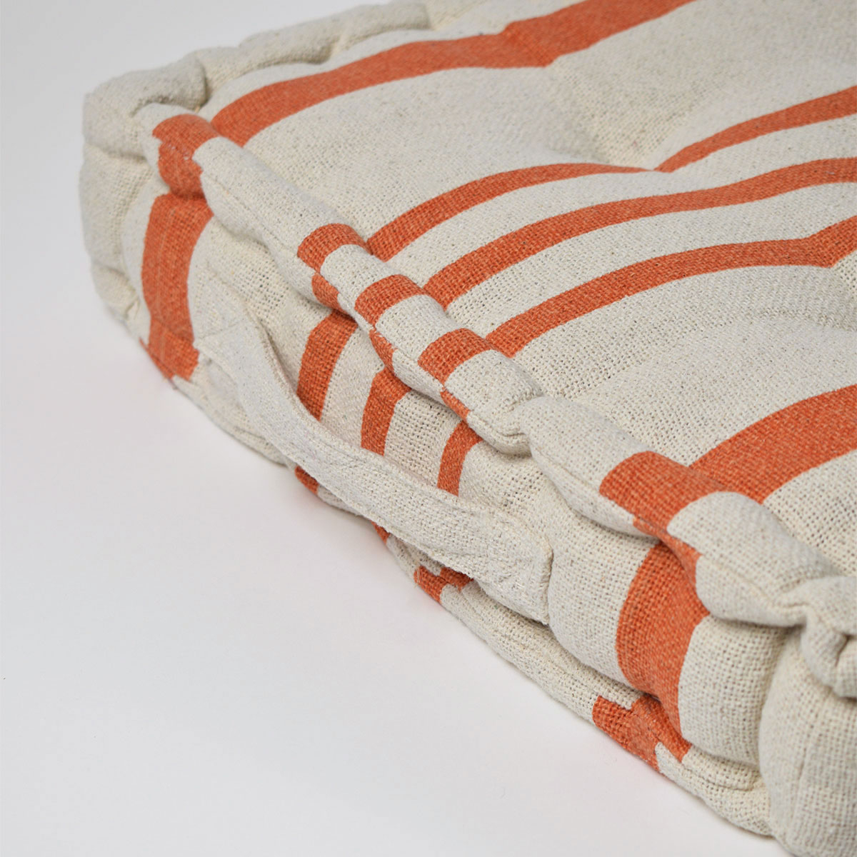 Μαξιλάρα δαπέδου σε εκρού απόχρωση με πορτοκαλί ρίγες. Το εξωτερικό ύφασμα είναι από 100% βαμβάκι και διαθέτει γέμιση από βαμβάκι στο εσωτερικό. Δεν διαθέτει φερμουάρ. Έχει χερούλι στο πλάι ώστε να μπορεί να μεταφερθεί με ευκολία. Δώστε μια αίσθηση χαλαρότητας και άνεσης, δημιουργώντας παράλληλα ένα έξτρα κάθισμα στο σαλόνι, τον κήπο ή το μπαλκόνι σας.
