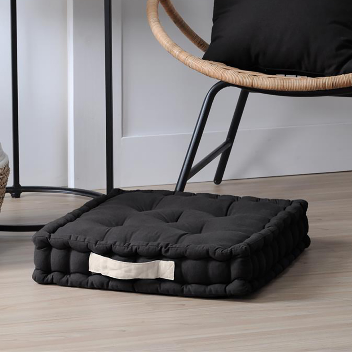 Μονόχρωμη μαξιλάρα δαπέδου σε μαύρο χρώμα και εκρού χερούλι. Το εξωτερικό ύφασμα είναι από 100% βαμβάκι και το εσωτερικό γέμισμα πολυεστερική βάτα. Διαθέτει χερούλι στο πλαϊνό για να μπορείτε να την μεταφέρετε με ευκολία. Δώστε μια αίσθηση χαλαρότητας και άνεσης στο χώρο σας, δημιουργώντας παράλληλα έξτρα καθίσματα με τις μαξιλάρες δαπέδου που θα βρείτε στο Spitishop.