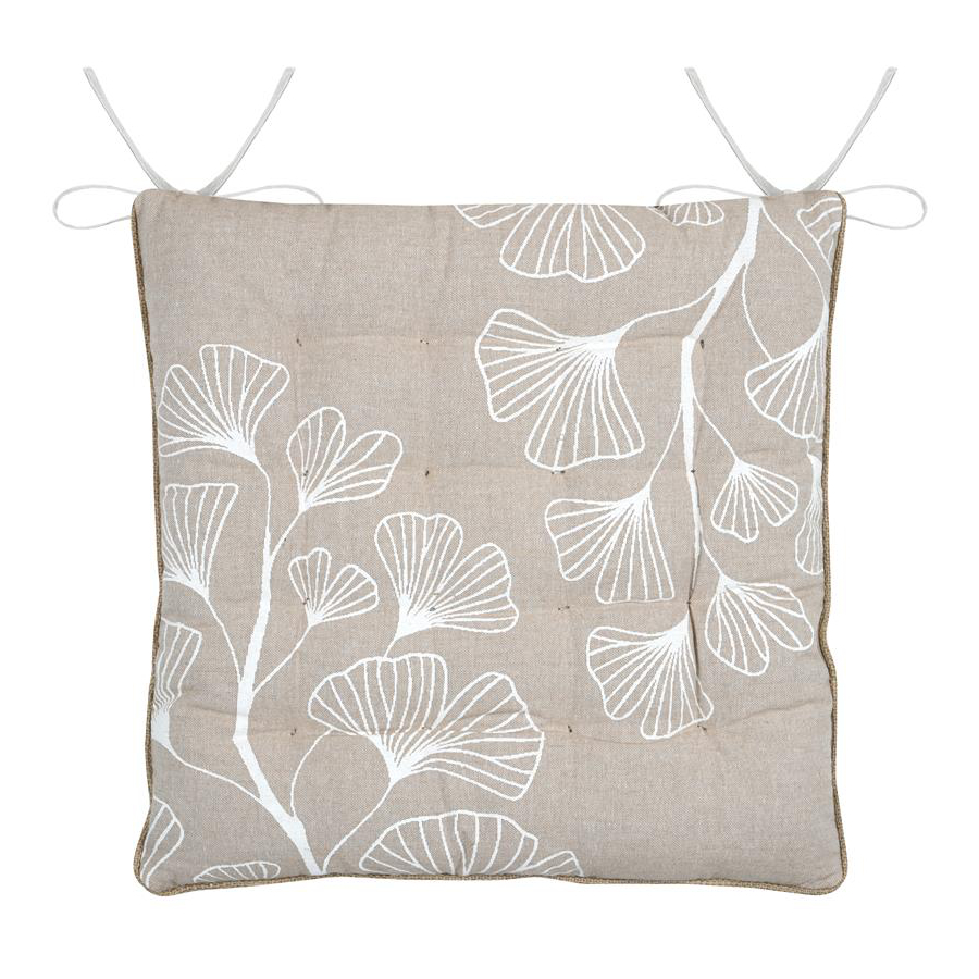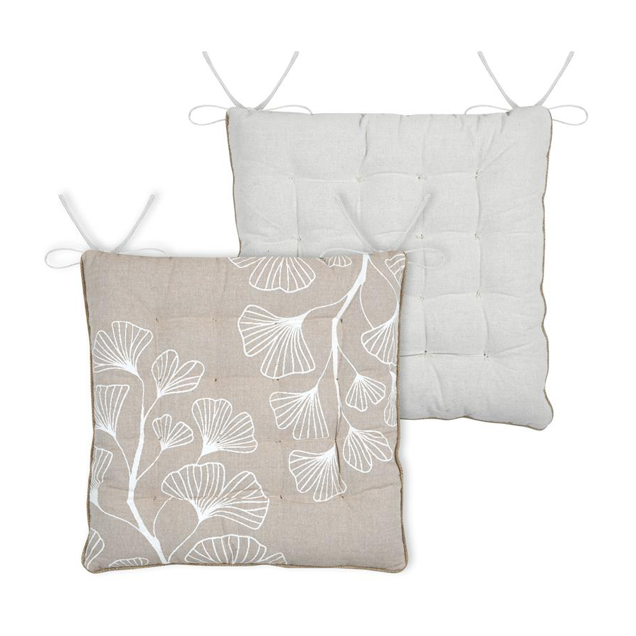 Μαξιλάρι καρέκλας διπλής όψης με την μια πλευρά να έχει μπεζ χρώμα με φλοράλ σχέδιο και λευκές λεπτομέρειες, ενώ η άλλη μεριά είναι μονόχρωμη μπεζ. Το εξωτερικό ύφασμα είναι από 55% βαμβάκι-45% polyester ενώ το εσωτερικό γέμισμα είναι πολυεστερική βάτα. Διαθέτει κορδονάκια στις 2 γωνίες για να δένει στην καρέκλα. Συνδυάστε το με τα υπόλοιπα είδη του ίδιου σετ για να δημιουργήστε ένα ξεχωριστό αποτέλεσμα.