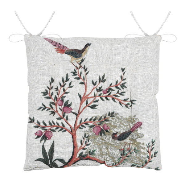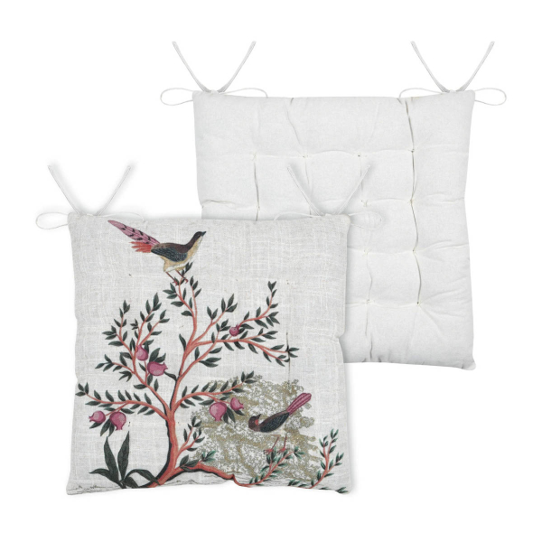 Μαξιλάρι καρέκλας διπλής όψης με την μια πλευρά να έχει λευκό-πράσινο χρώμα με φλοράλ σχέδιο και ροζ-μπεζ λεπτομέρειες, ενώ η άλλη μεριά είναι μονόχρωμη λευκή. Το εξωτερικό ύφασμα είναι από 50% βαμβάκι-46% polyester-4% λινό ενώ το εσωτερικό γέμισμα είναι πολυεστερική βάτα. Διαθέτει κορδονάκια στις 2 γωνίες για να δένει στην καρέκλα. Συνδυάστε το με τα υπόλοιπα είδη του ίδιου σετ για να δημιουργήστε ένα ξεχωριστό αποτέλεσμα.