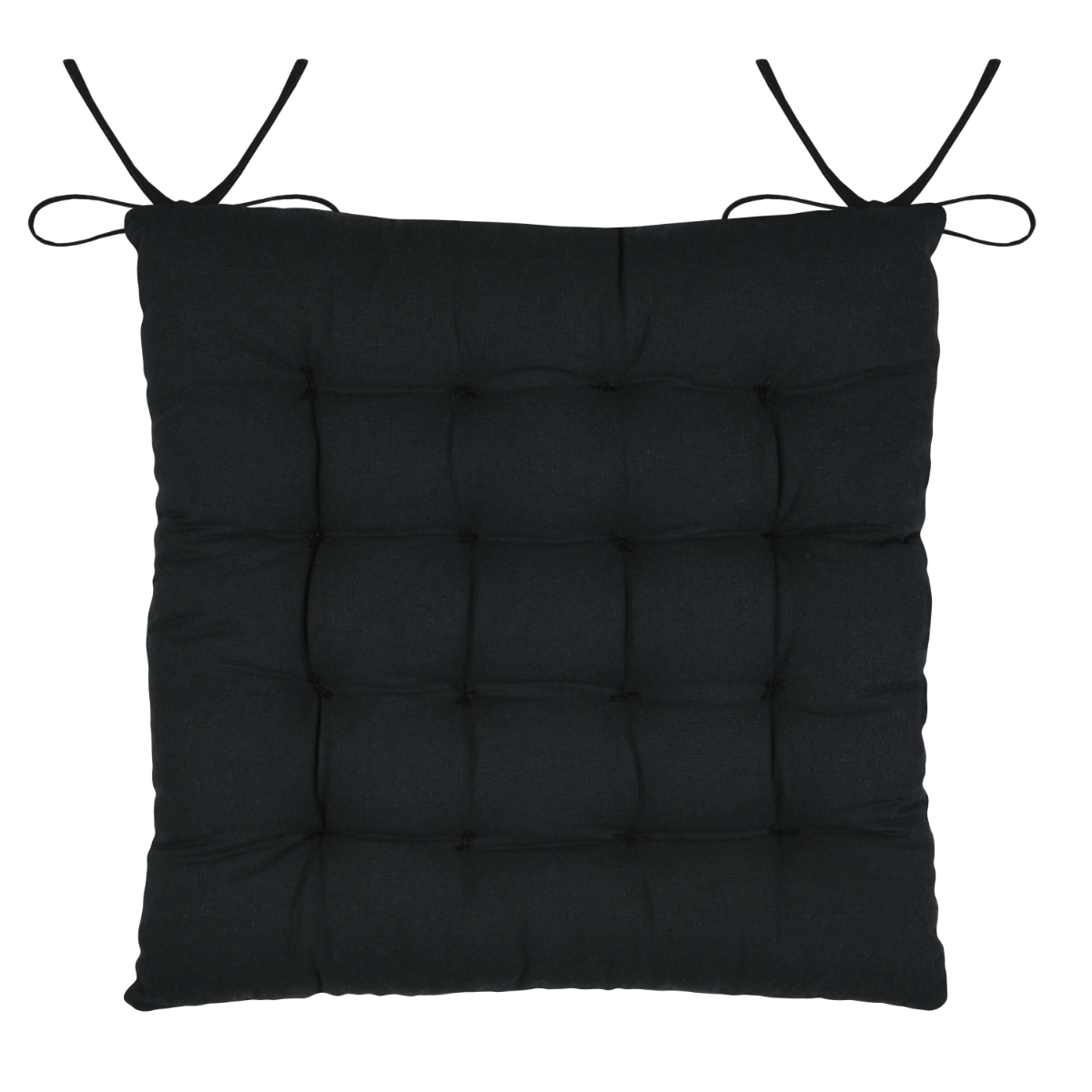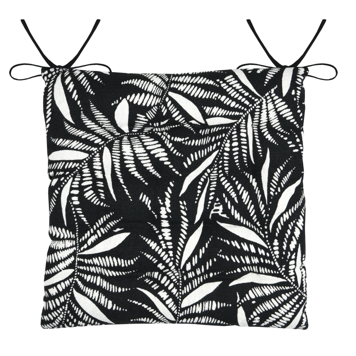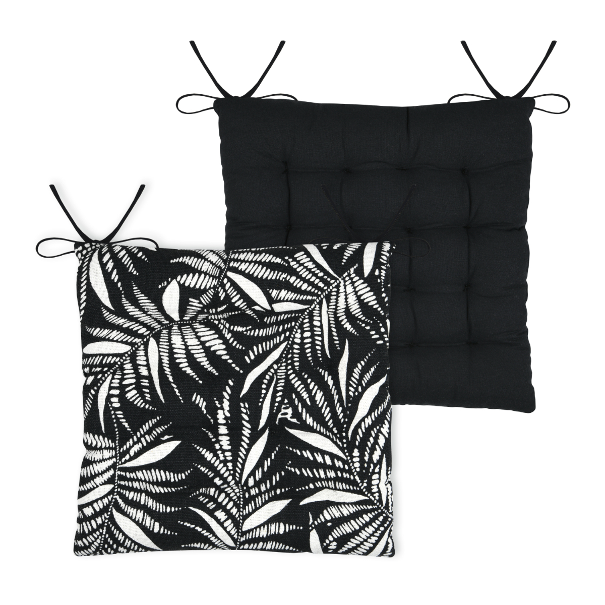 Μαξιλάρι καρέκλας διπλής όψης με την μια πλευρά να έχει μαύρο φόντο με φλοράλ σχέδιο και λευκές λεπτομέρειες, ενώ η άλλη μεριά είναι μονόχρωμη μαύρη. Το εξωτερικό ύφασμα είναι από 100% βαμβάκι ενώ το εσωτερικό γέμισμα είναι πολυεστερική βάτα. Διαθέτει κορδονάκια στις 2 γωνίες για να δένει στην καρέκλα. Συνδυάστε το με τα υπόλοιπα είδη του ίδιου σετ για να δημιουργήσετε ένα ξεχωριστό αποτέλεσμα.
