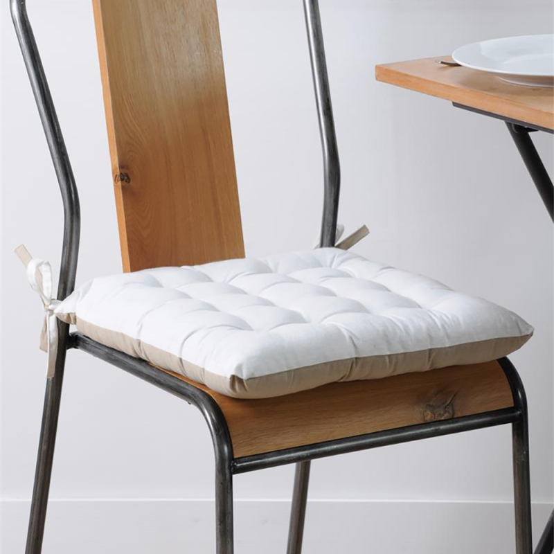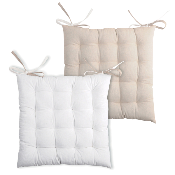 Μαξιλάρια καρέκλας διπλής όψης με διαφορετικό χρώμα σε κάθε πλευρά. Σε εκρού απόχρωση από την μια πλευρά και σε λευκό από την άλλη. Η σύνθεση του εξωτερικού υφάσματος αποτελείται από 100% βαμβάκι, ενώ το εσωτερικό γέμισμα από πολυεστερική βάτα βάρους 170gsm. Διαθέτει κορδονάκια στις 2 γωνίες για να δένει στην καρέκλα. Προσφέρετε άνεση στις καρέκλες του τραπεζιού σας με τα μαξιλάρια καθίσματος που θα βρείτε στο Spitishop!