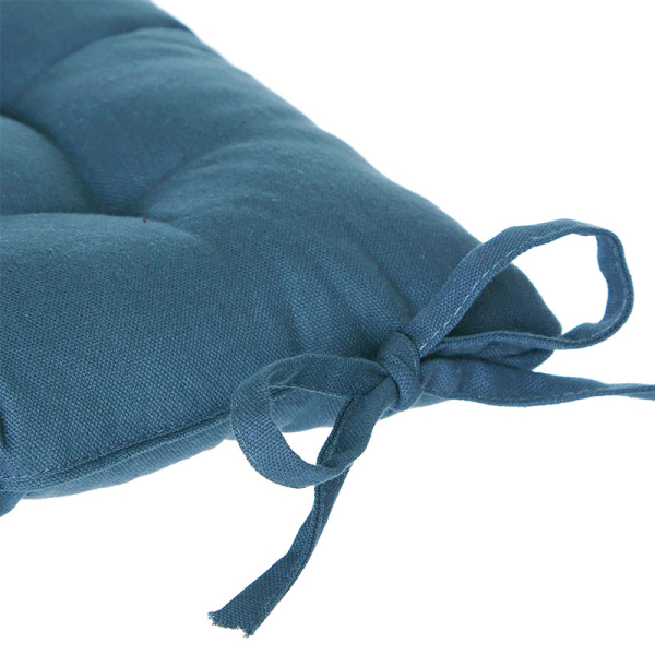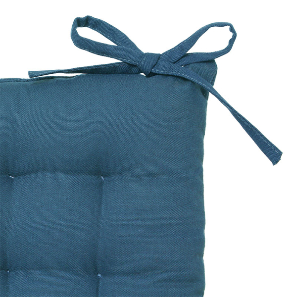 Μαξιλάρι καρέκλας μονόχρωμο σε πετρόλ χρώμα. Η σύνθεση του εξωτερικού υφάσματος αποτελείται από 100% βαμβάκι, ενώ το εσωτερικό γέμισμα είναι από ανακυκλωμένο βαμβάκι. Διαθέτει κορδονάκια στις 2 γωνίες για να δένει στην καρέκλα. Ιδανικό μαξιλάρι για να ανανεώσετε την αισθητική του χώρου σας.