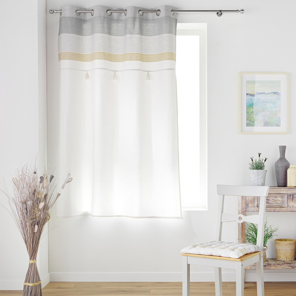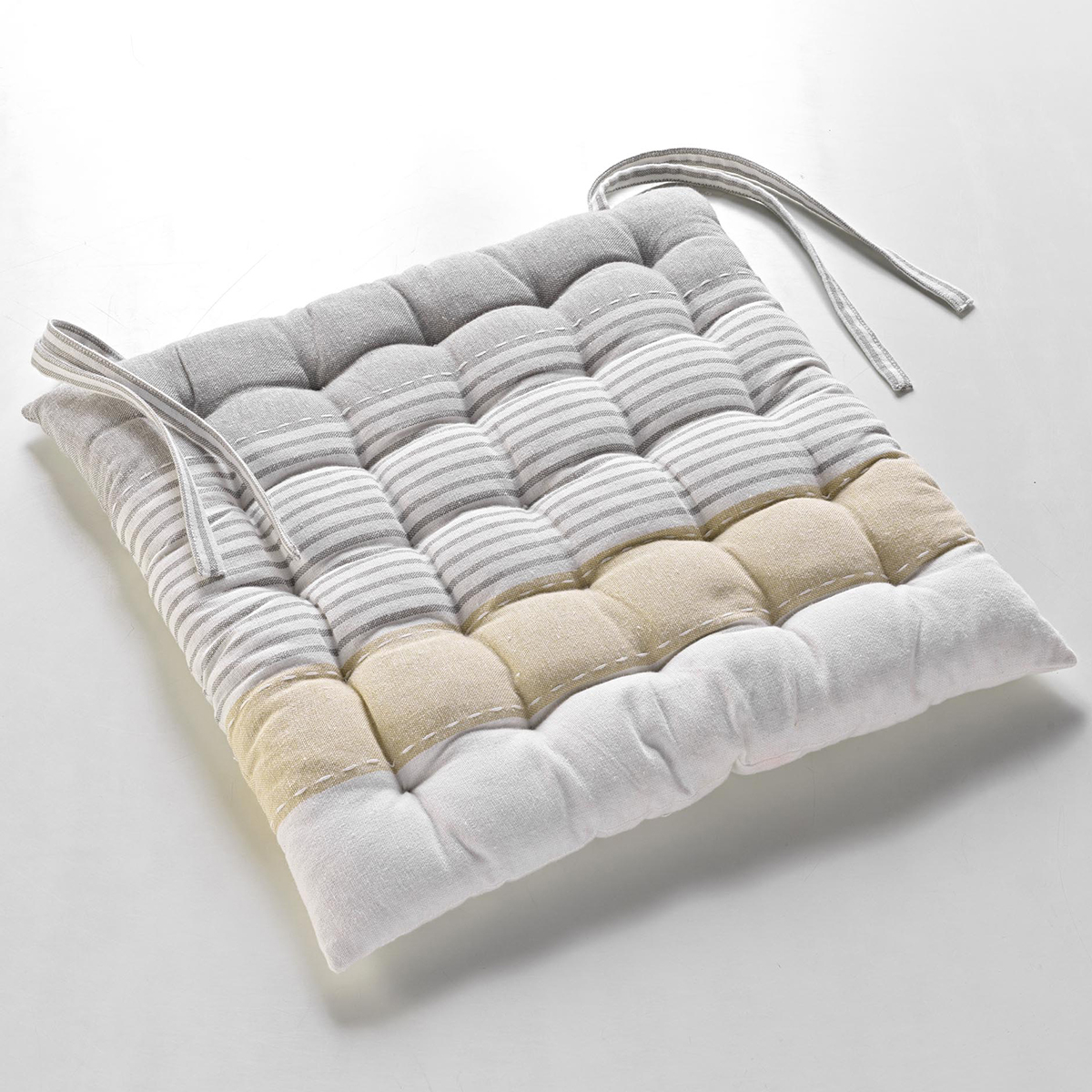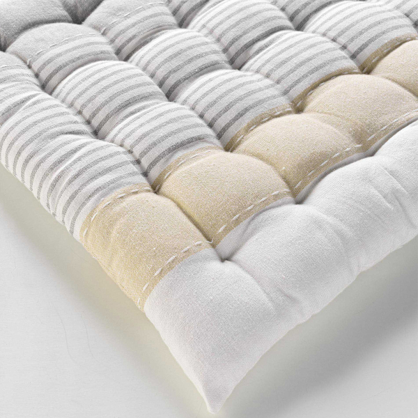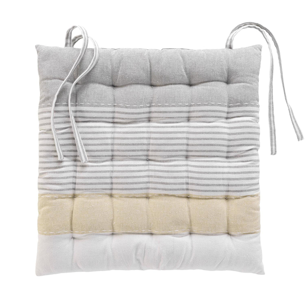 Μαξιλάρι καρέκλας σε λευκό χρώμα με γκρι -μπεζ λεπτομέρειες και ριγέ σχέδιο. Το εξωτερικό ύφασμα από 66% βαμβάκι και 34% polyester, ενώ το εσωτερικό γέμισμα πολυεστερική βάτα. Διαθέτει κορδονάκια στις 2 γωνίες για να δένει στην καρέκλα. Συνδυάστε το με τα υπόλοιπα είδη του ίδιου σετ για να δημιουργήστε ένα ξεχωριστό στυλ.