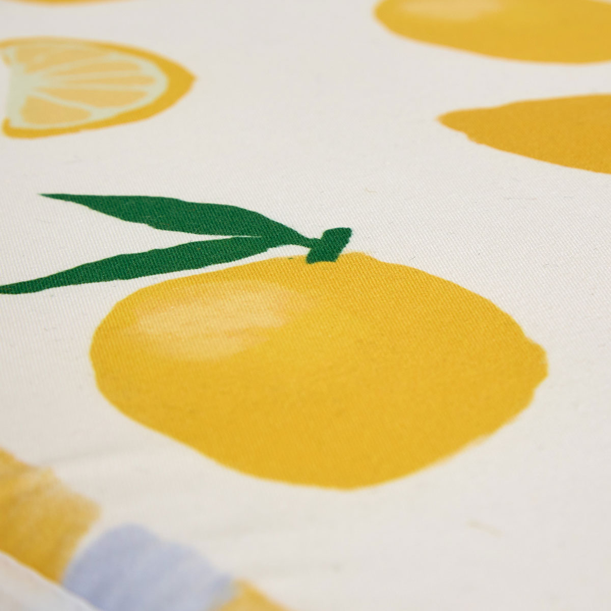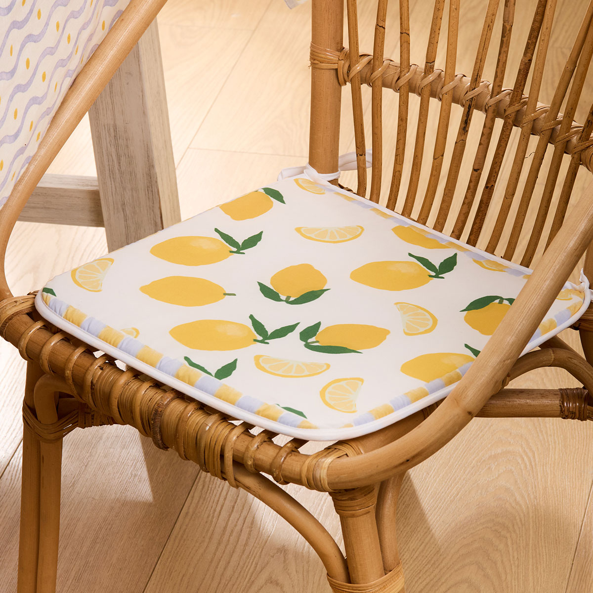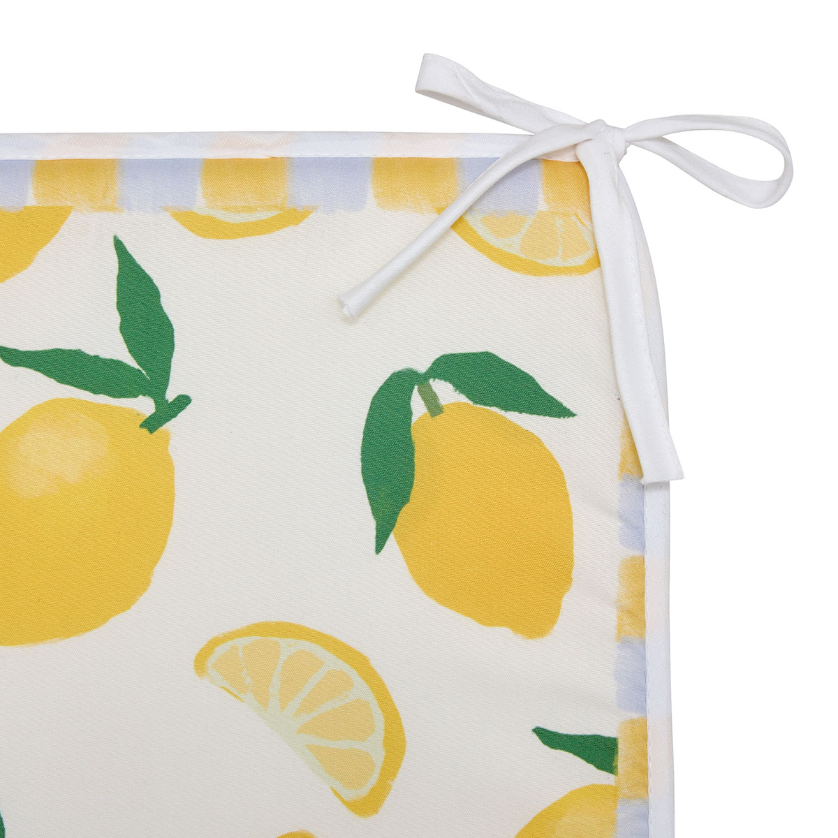 Μαξιλάρι καρέκλας κατασκευασμένο από 100% polyester σε λευκό χρώμα με κίτρινο και πράσινο μοντέρνο σχέδιο με λεμόνια. Εσωτερικά διαθέτει μαλακή πολυεστερική γέμιση για μεγαλύτερη άνεση. Διαθέτει κορδονάκια σε λευκό χρώμα στις 2 γωνίες για να μπορεί να δεθεί στην καρέκλα ώστε να μένει σταθερό. Ιδανικό μαξιλάρι που θα ταιριάξει σε κάθε σπίτι. Με πιστοποίηση OEKO-TEX. Συνδυάστε το με τα υπόλοιπα είδη της σειράς για ένα ολοκληρωμένο αποτέλεσμα στο χώρο σας.