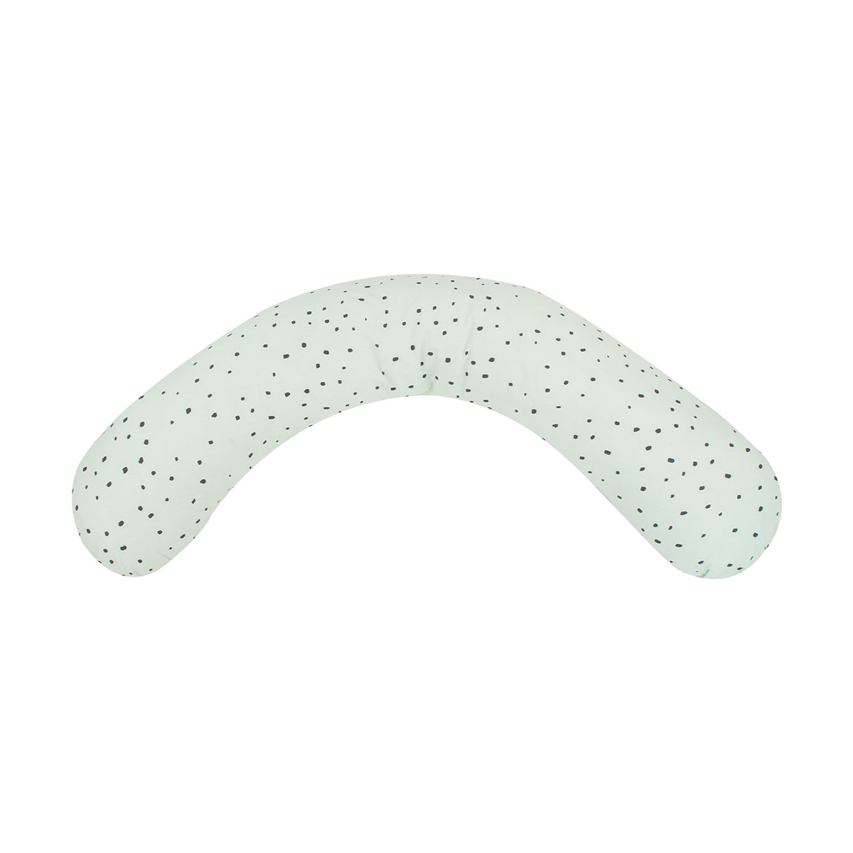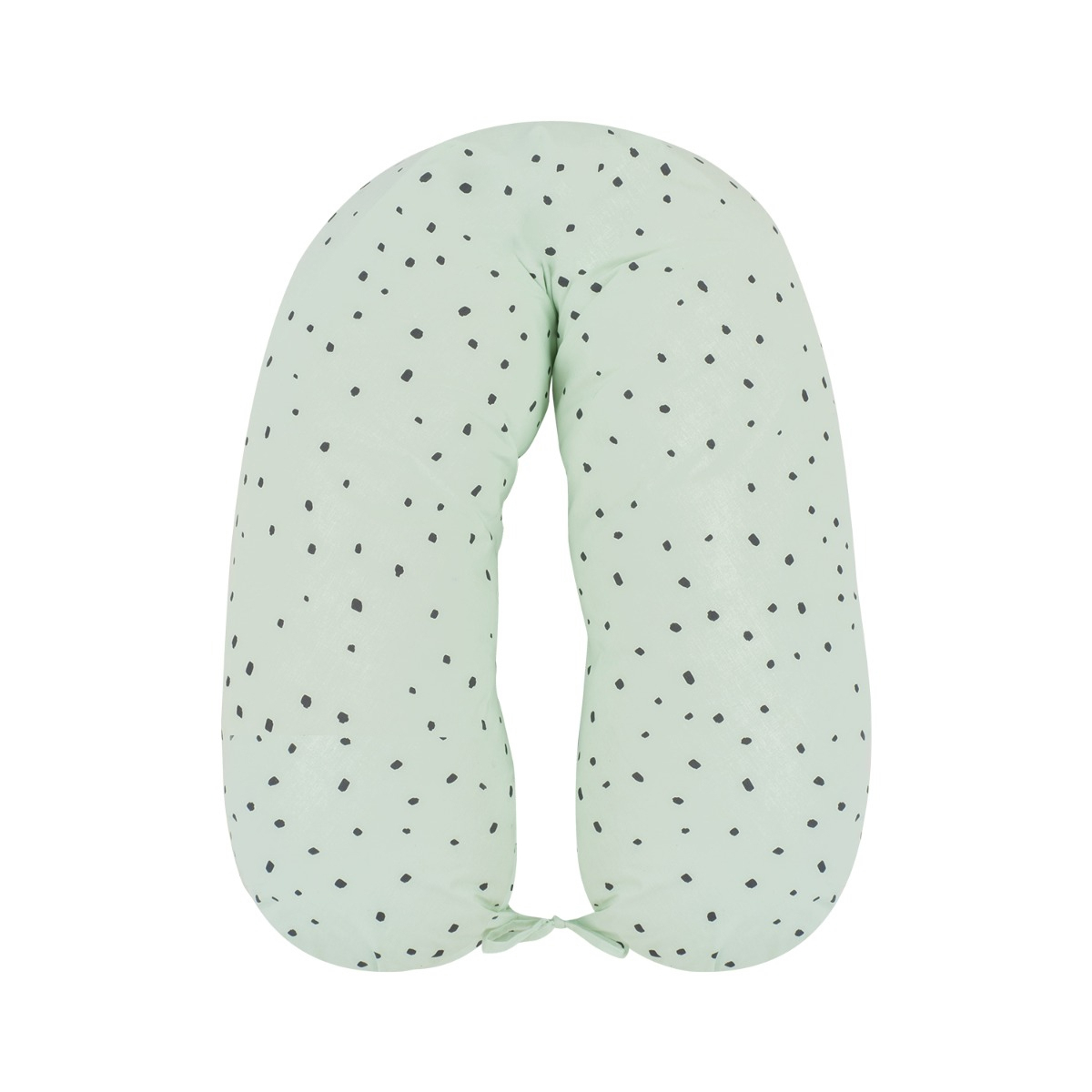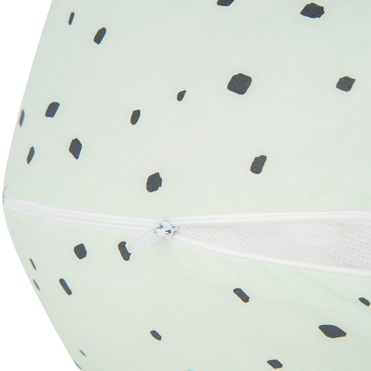 Πολυλειτουργικό μαξιλάρι από την εταιρεία Kikka Boo σε βεραμάν χρώμα με πουά σχέδιο και ανθρακί λεπτομέρειες. Το εξωτερικό του ύφασμα είναι 100% βαμβάκι με πιστοποίηση OEKO–TEX ενώ η γέμισή του είναι από βάτα polyester. Ανοίγει με φερμουάρ για αφαιρείτε την γέμιση και να πλύνετε το κάλυμμα. Μπορεί να χρησιμοποιηθεί ως μαξιλάρι θηλασμού, πάντα κρεβατιού, σαν ένα τεχνητό όριο για το μωρό όταν αρχίζει να μπουσουλάει και να εξερευνά, σαν σφήνα στο πλάι ή στο κεφαλάρι του κρεβατιού, ανάμεσα στο κρεβάτι και στον τοίχο. Στο κάτω μέρος έχει κορδονάκια για να δένεται και να παραμένει κλειστό.