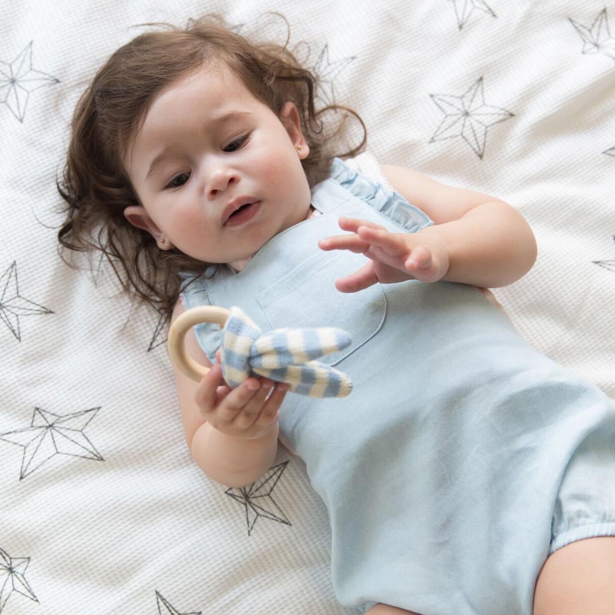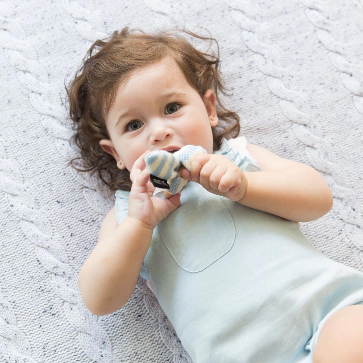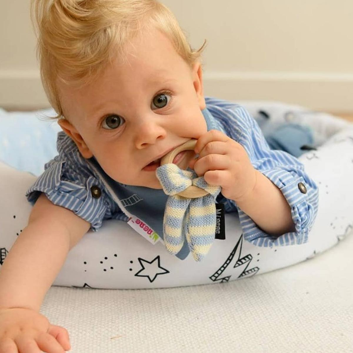 Μασητικό της εταιρίας Minene. Έχει καφέ χρώμα, σιέλ -λευκές λεπτομέρειες και ριγέ σχέδιο. Το ξύλο είναι από οικολογικό Bamboo ενώ τα αυτάκια από βαμβακερό νήμα. Ιδανικό προϊόν για να καταπραΰνει τα ερεθισμένα ούλα και ανακουφίζει τα βρέφη από τον πόνο στα δοντάκια κατά την περίοδο οδοντοφυΐας.