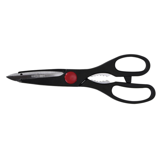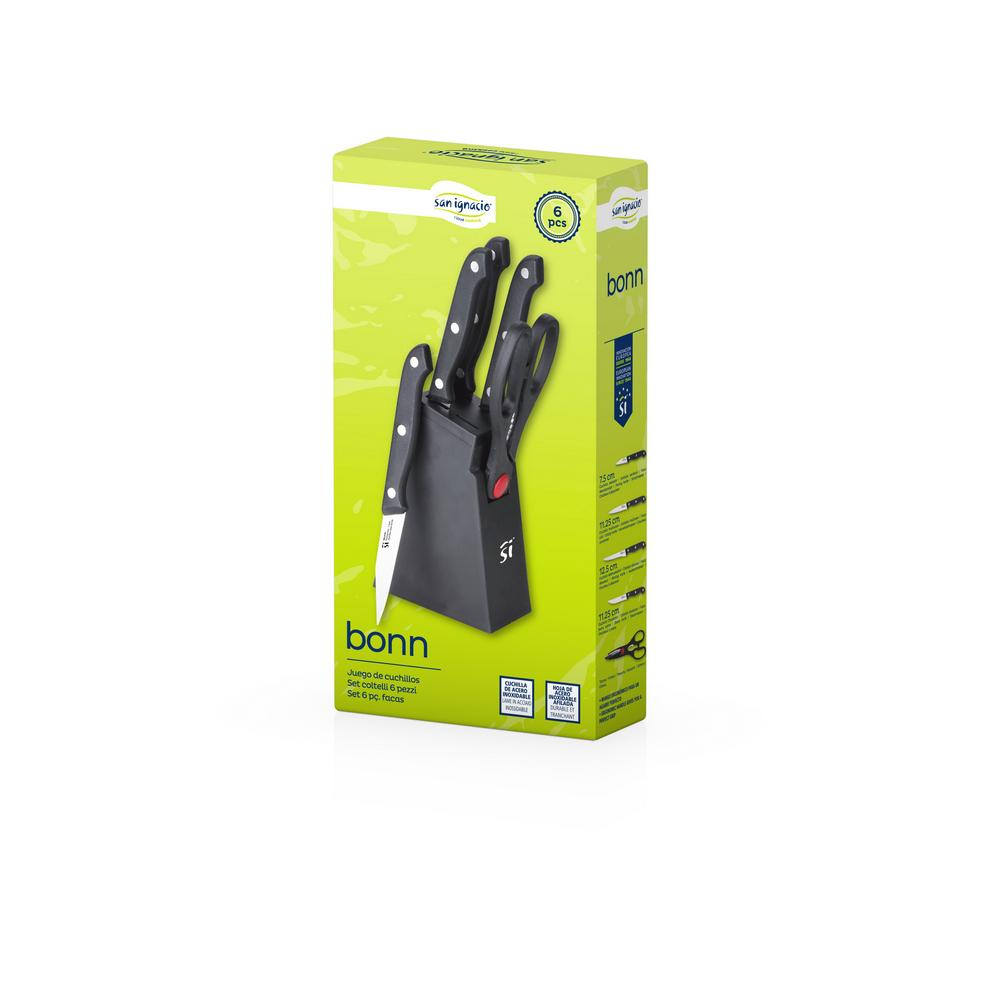 Εργαλεία κουζίνας σε βάση σετ από τη εταιρεία Bergner σε μαύρο χρώμα. Τα μαχαίρια είναι κατασκευασμένα από ανοξείδωτο ατσάλι. Έχουν λαβή σε μαύρο σετ. Το σετ αποτελείται από ένα μαχαίρι γενικής χρήσης, ένα μαχαίρι ξεκοκκαλίσματος, ένα μαχαίρι κρέατος, ένα μαχαίρι ξεφλουδίσματος, ένα ψαλίδι και μία βάση. Η πρακτική βάση τους σας επιτρέπει να τα έχετε πάντα οργανωμένα και τακτοποιημένα στον πάγκο της κουζίνας σας.