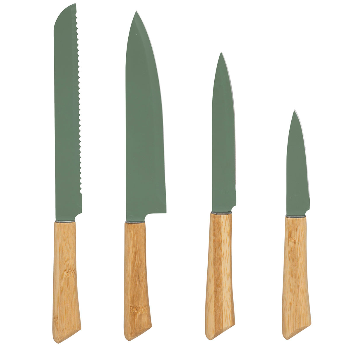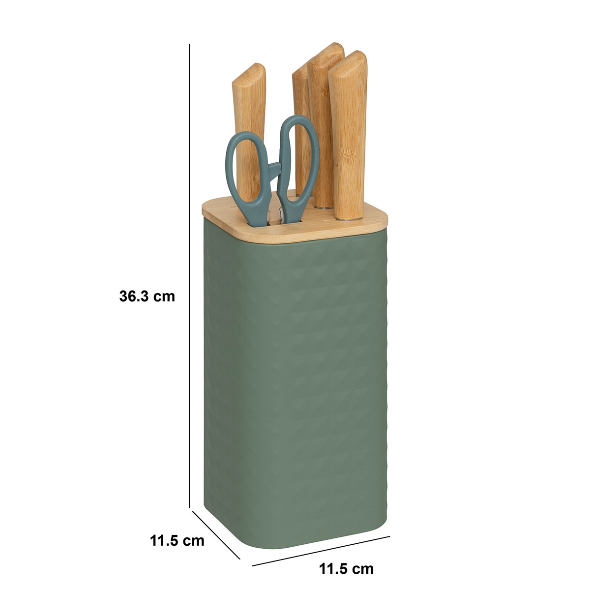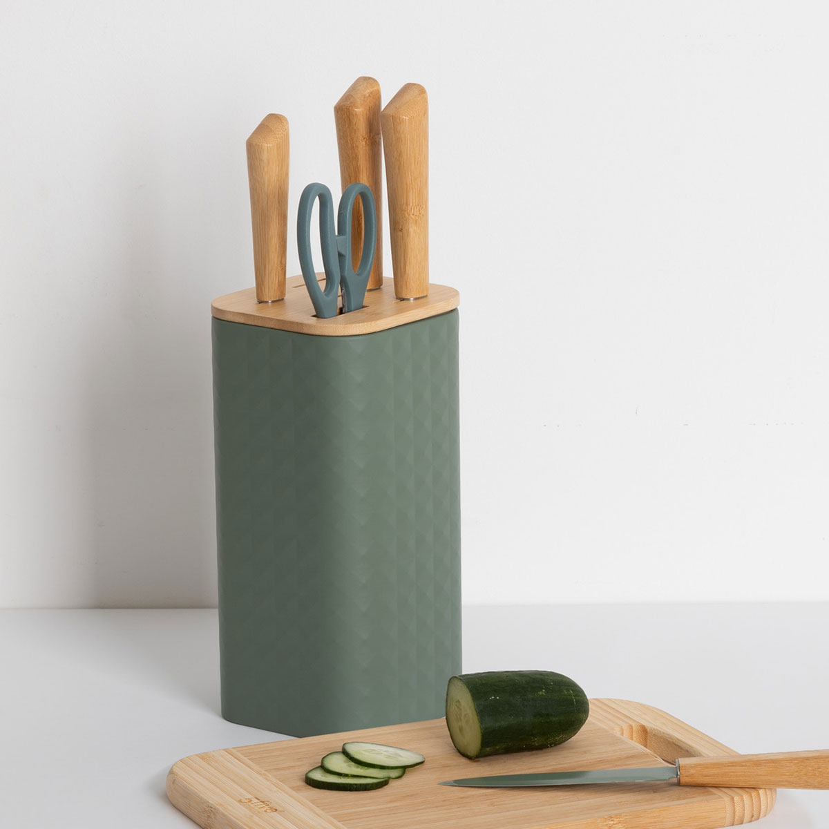 Σετ με μαχαίρια και ψαλίδι κουζίνας σε βάση. Το σετ περιλαμβάνει: 1 μαχαίρι ψωμιού, 1 μαχαίρι σεφ, 1 μαχαίρι γενικής χρήσης, 1 μαχαίρι ξεφλουδίσματος, 1 ψαλίδι κουζίνας & 1 βάση. Είναι κατασκευασμένα από ξύλο bamboo σε χακί χρώμα με ανοξείδωτες λάμες. Ξύλο με πιστοποίηση FSC. Ιδανικό σετ για κάθε κουζίνα.