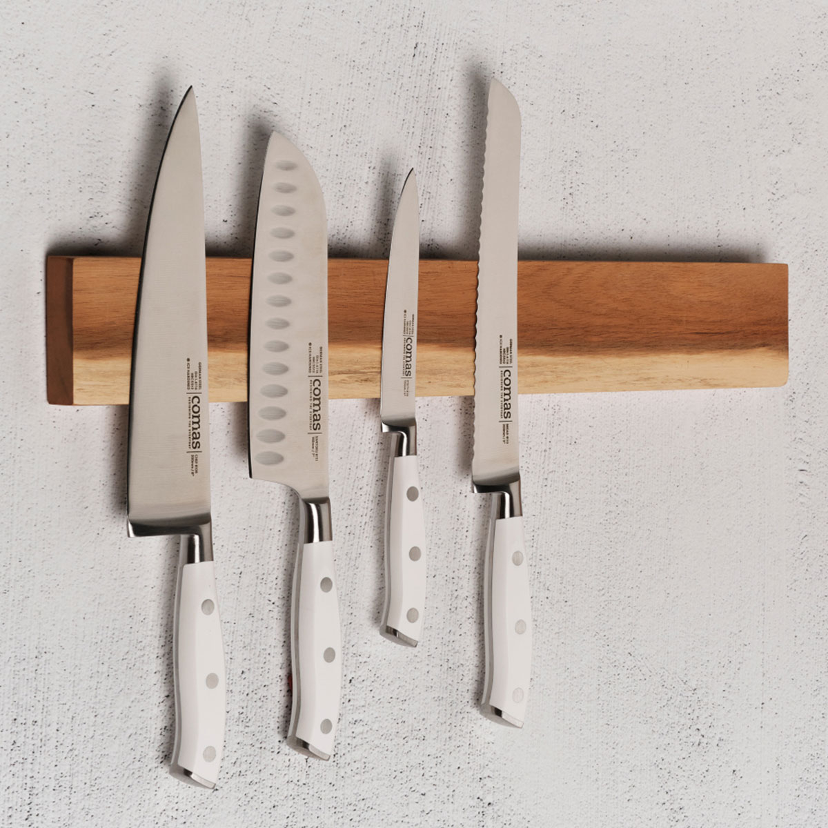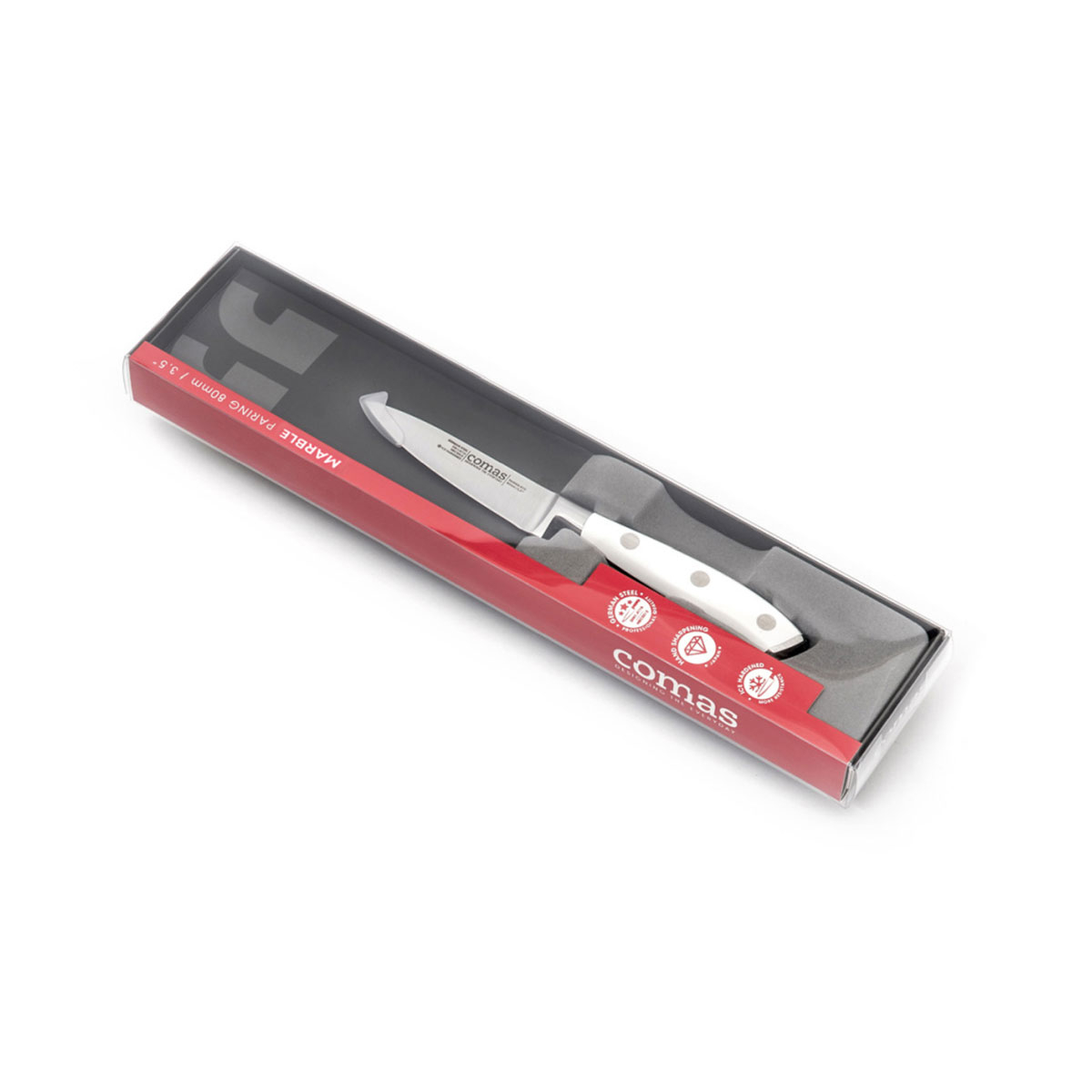 Μαχαίρι ξεφλουδίσματος από την εταιρεία Comas. Η κοφτερή λεπίδα του είναι κατασκευασμένη από ανοξείδωτο ατσάλι και διαθέτει λαβή σε λευκό χρώμα.