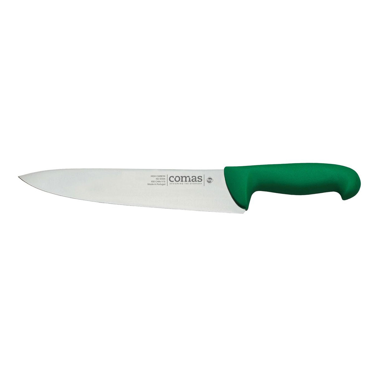 Μαχαίρι του σεφ από την εταιρεία Comas. Η κοφτερή λεπίδα του είναι κατασκευασμένη από ανοξείδωτο ατσάλι και διαθέτει εργονομική λαβή σε πράσινο χρώμα. Ιδανικό μαχαίρι για κόψιμο ακριβείας.