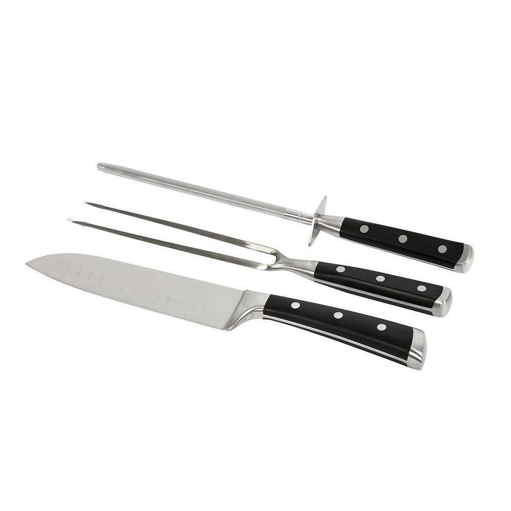 Σετ εργαλείων κρέατος από την εταιρεία Espiel με μαύρες λαβές. Είναι κατασκευασμένα από ανοξείδωτο ατσάλι και έχουν πλαστική λαβή από ABS. Το σετ περιλαμβάνει ένα μαχαίρι shantoku κατάλληλο για διάφορες τεχνικές κοπής όπως το ψιλοκόψιμο, το κόψιμο σε φέτες και το τεμαχισμό. Έχει λεπτή και ελαφριά κατασκευή για άνεση. Μία πιρούνα για να μετακινείτε εύκολα μεγάλα κομμάτια κρέατος και να μπορείτε να τα κόβετε για να τα σερβίρετε. Επίσης, ένα ακονιστήρι για να κάνετε πιο αιχμηρές τις άκρες των μαχαιριών. Ιδανικό σετ με εργαλεία κρέατος κατάλληλο για τους λάτρεις του μπάρμπεκιου.