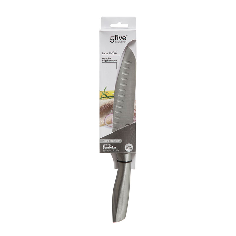 Μαχαίρι Santoku από ανοξείδωτο ατσάλι. Διαθέτει εργονομική λαβή σε ασημί χρώμα για ακρίβεια στο κόψιμο. Διαθέτει λάμα 18εκ.