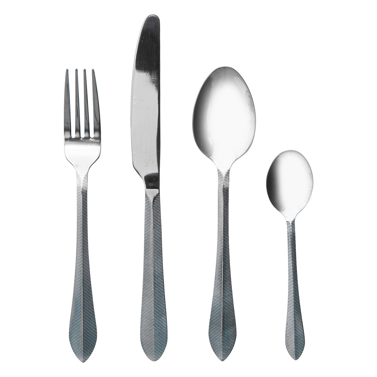 Σετ μαχαιροπίρουνα 24 τεμαχίων ανοξείδωτα, σε ασημί απόχρωση. Το σετ αποτελείται από 6 πιρούνια, 6 κουτάλια σούπας, 6 κουταλάκια του γλυκού και 6 μαχαίρια.